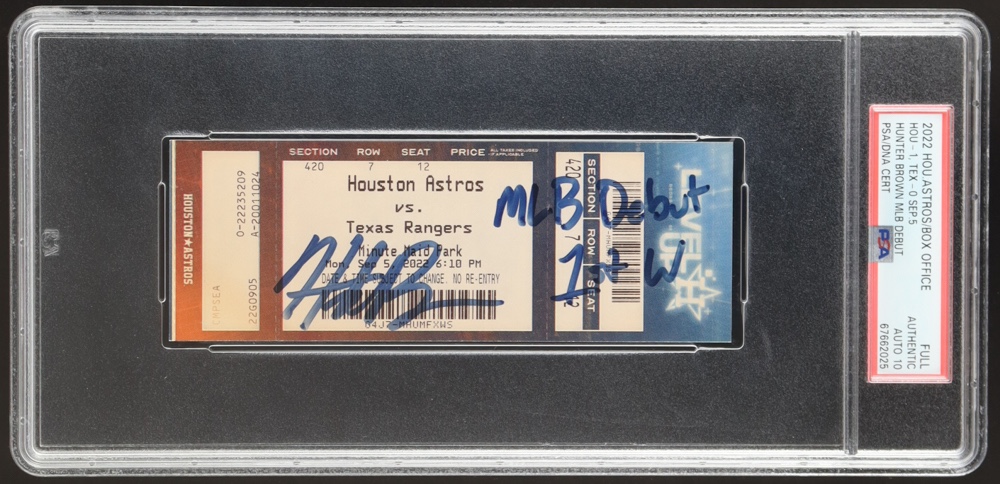 Houston Astros vs. Texas Rangers ticket stub, dated September 5th, 2022. Hand-signed and inscribed by Hunter Brown (Houston Astros). Autograph is graded PSA 10.