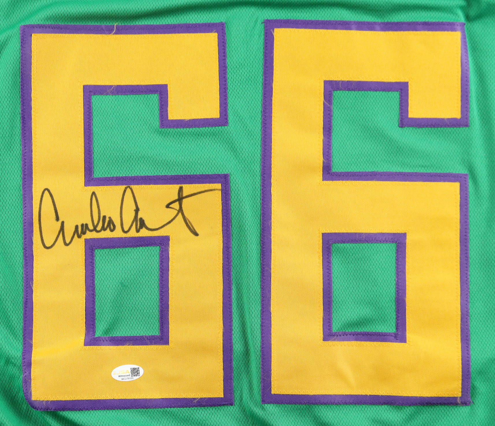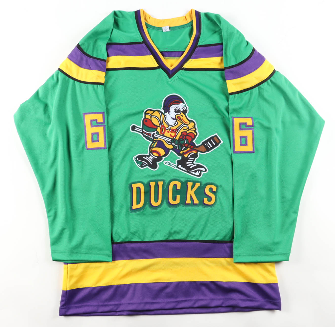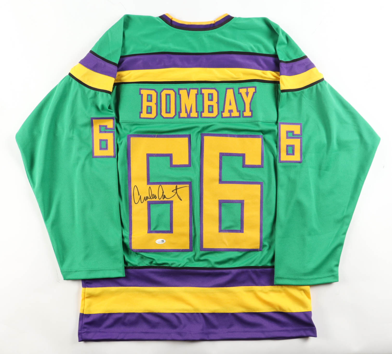 Custom jersey with everything sewn on, size XL. Hand-signed by Emilio Estevez (Gordon Bombay).