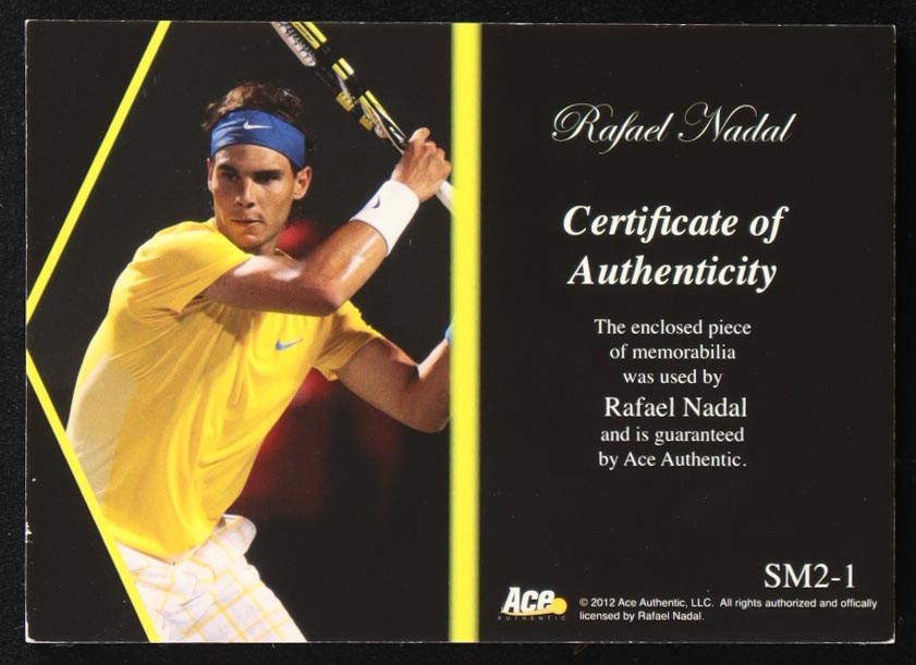 Rafael Nadal 2012 Ace Authentic Grand Slam 3 Match Used Memorabilia #SM2