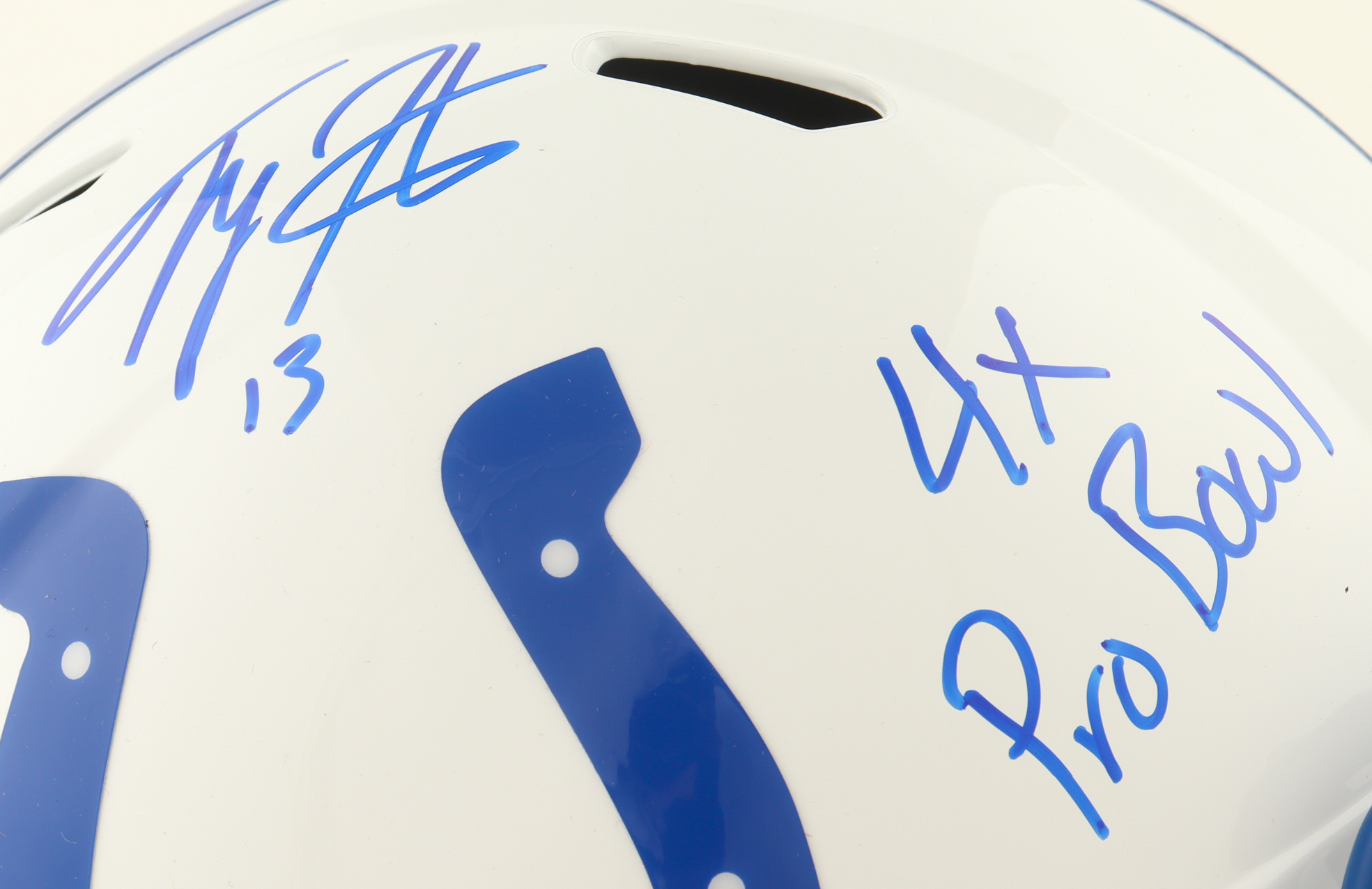 Riddell Indianapolis Colts full-size replica Speed helmet. Hand-signed and inscribed by T. Y. Hilton.