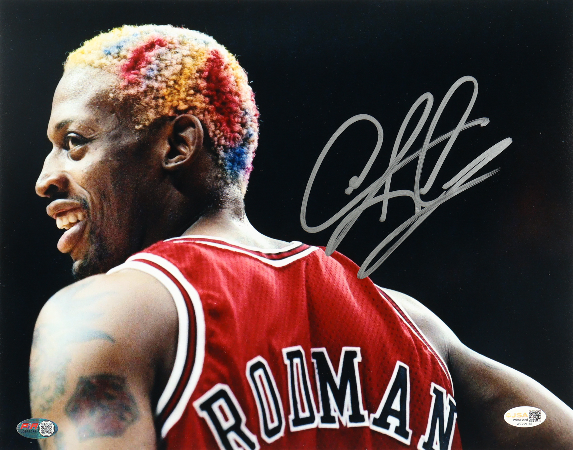 Photo measures 11" x 14" in size and has been hand-signed by Dennis Rodman (Chicago Bulls, HOF).