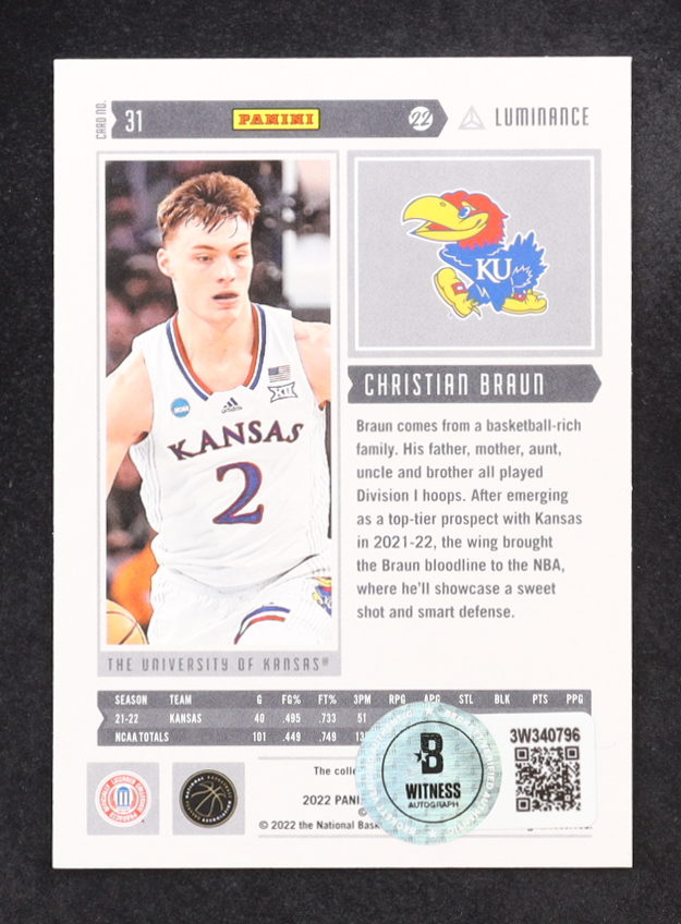 Card has been hand-signed by Christian Braun (Kansas City Jayhawks). Please see photos for details regarding the condition of the card.