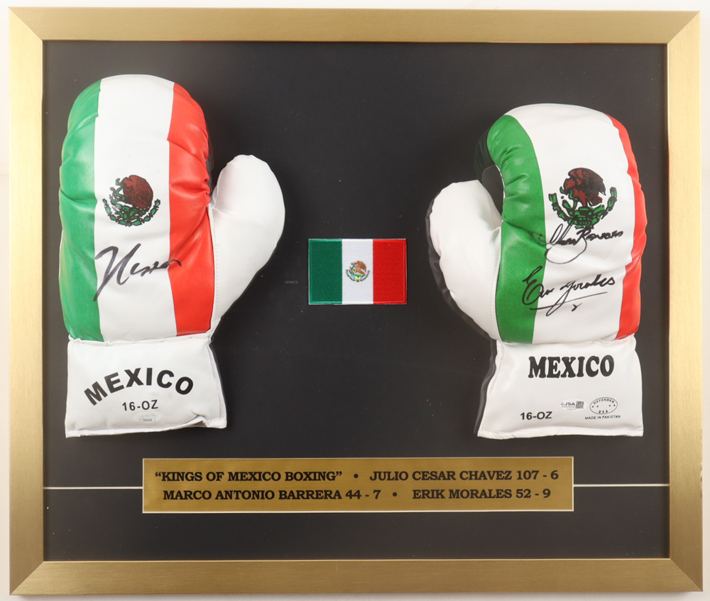 Julio Cesar Chavez, Marco Antonio Barrera & Erik Morales Signed Custom Framed Set of (2) Mexico Professional Boxing Gloves (JSA)