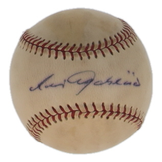 Wilson Official Major League Baseball. Hand-signed and inscribed by Luis Aparicio (Chicago White Sox, HOF). Please note, the baseball is naturally toned and stained throughout, and the signature is fading.
