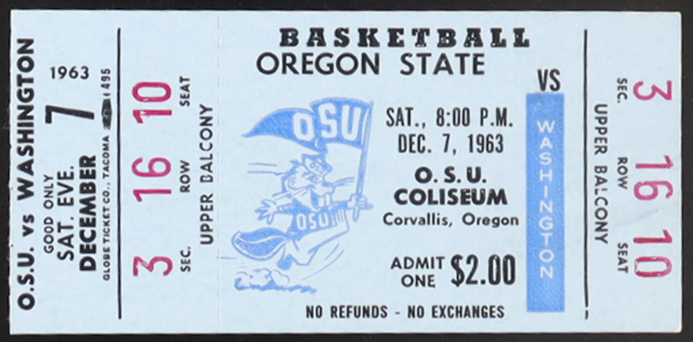 1963 Oregon State vs Washington State Basketball Game Ticket