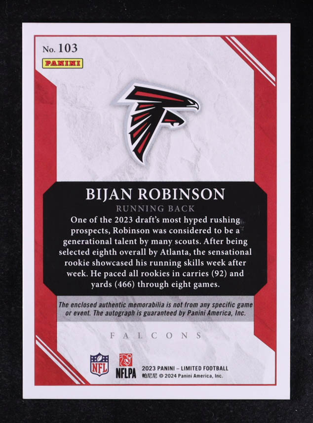 Bijan Robinson 2023 Panini Limited Ruby Spotlight Rookie Patch Autographs #103 #12/49 RC
