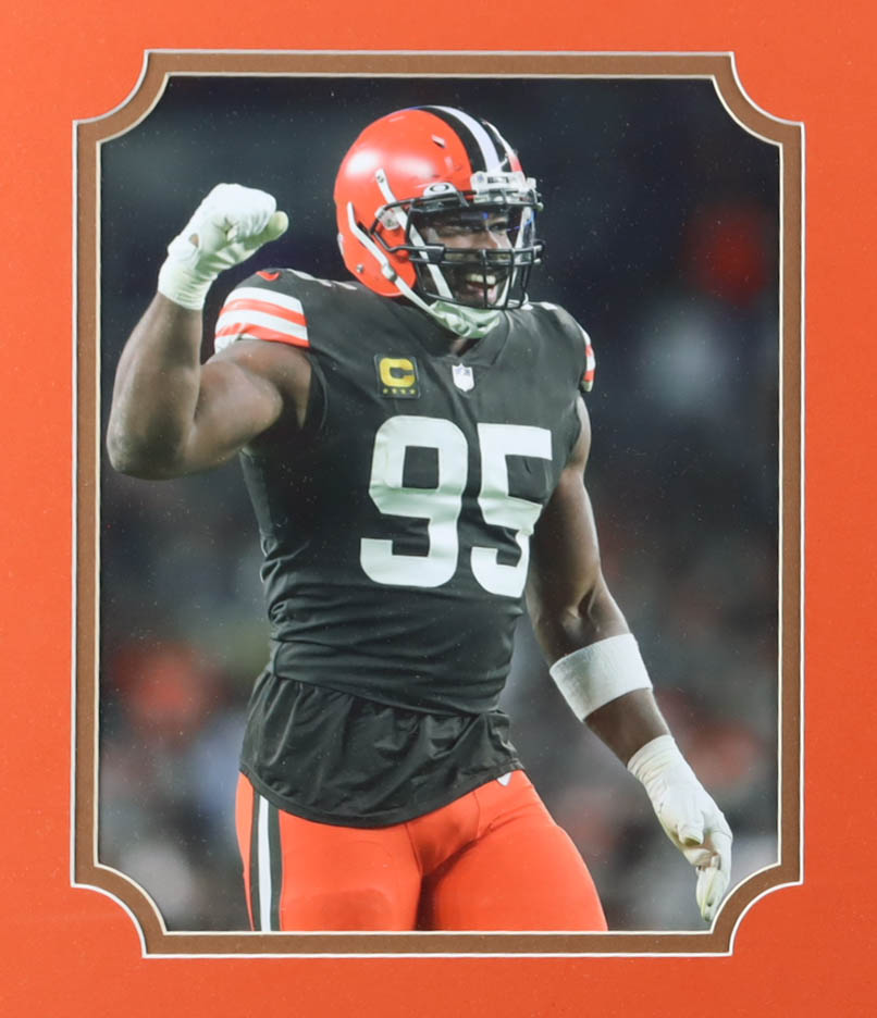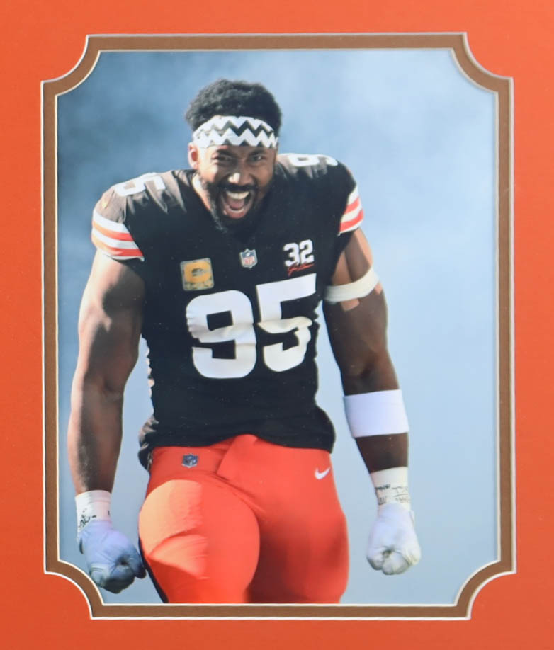 Custom frame measures 23" x 33" in size and features a 2017 Panini Certified Orange #198/199 #136 Rookie RC card that has been hand-signed by Myles Garrett