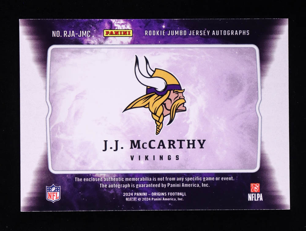 JJ McCarthy 2024 Panini Origins Rookie Jumbo Jersey Autographs Red #JMC RC #08/99