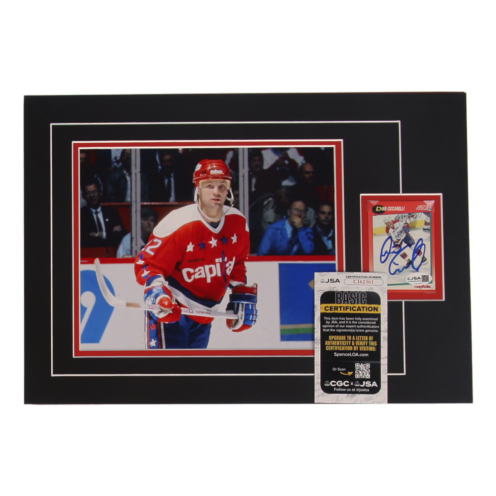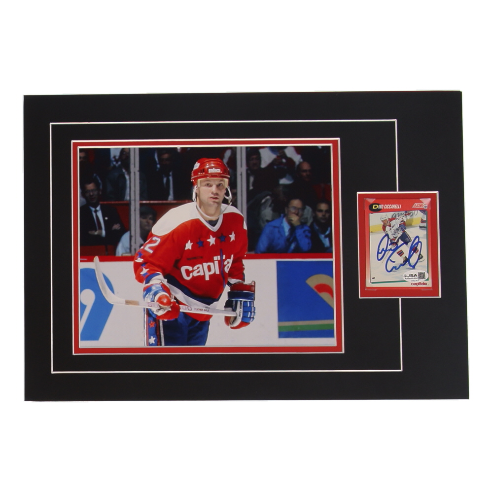 Custom display measures approximately 12" x 17" in size and features a sports card that has been hand-signed by DIno Ciccarelli (Washington Capitals, HOF).