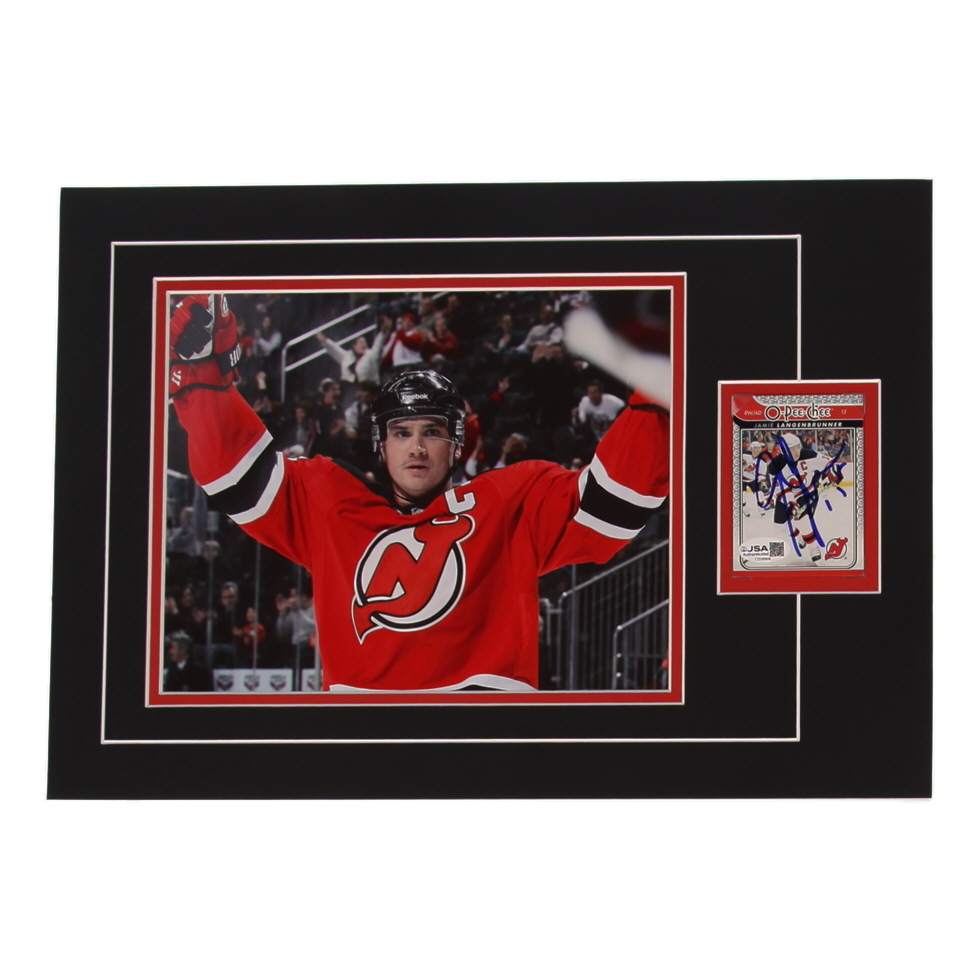 Custom display measures approximately 12" x 17" in size and features a sports card that has been hand-signed by Jamie Langenbrunner (New Jersey Devils).