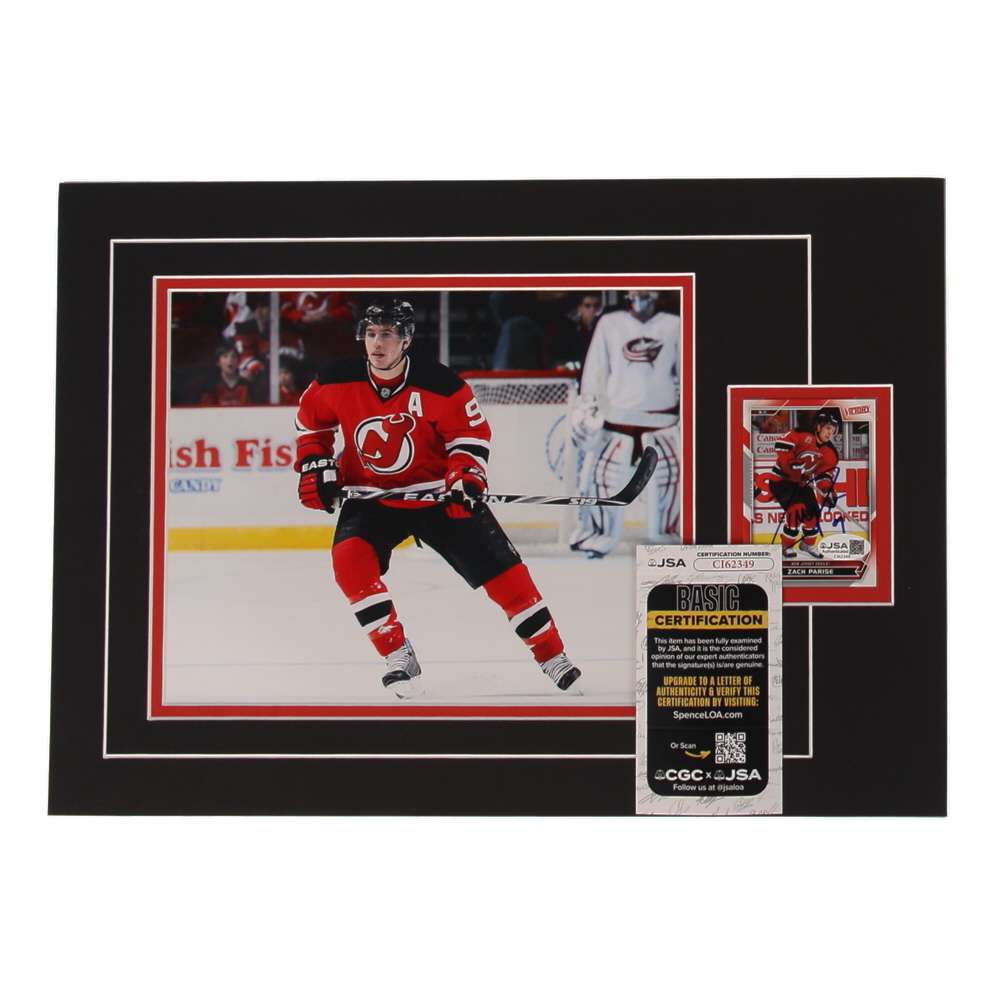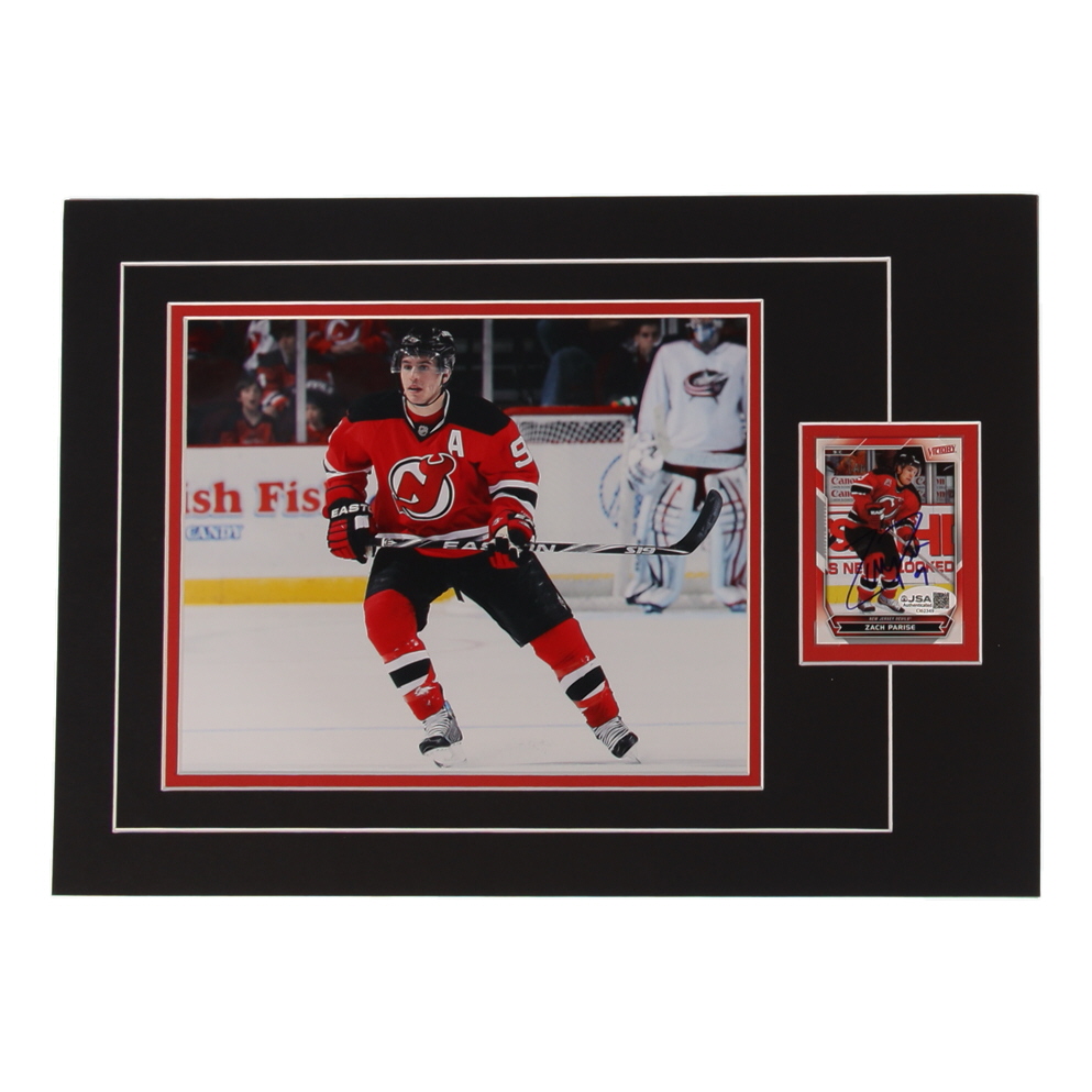 Custom display measures approximately 12" x 17" in size and features a sports card that has been hand-signed by Zach Parise (New Jersey Devils).