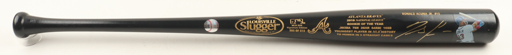 Louisville Slugger 2020 Signature Edition Commemorative Player Model baseball bat has been hand-signed by Ronald Acuna Jr. (Atlanta Braves).