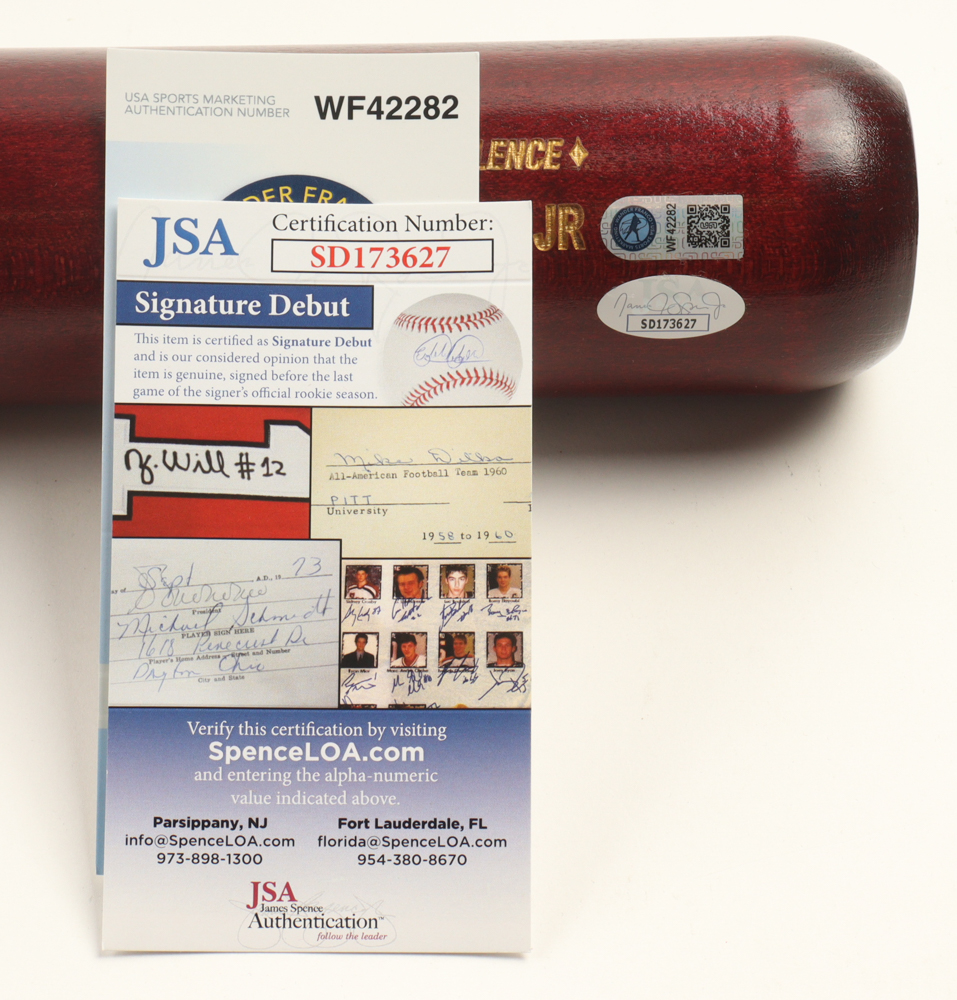 The lot / autograph(s) includes an official USA Sports Marketing Wander Franco hologram and COA as well as an official James Spence Authentication (JSA) "Signature Debut" hologram and COA. "Signature Debut" is the autographed memorabilia equivalent to a rookie card. The JSA definition of a "Signature Debut" is as follows: "Any item that is autographed and received by JSA prior to the last game of the signer's official rookie season.