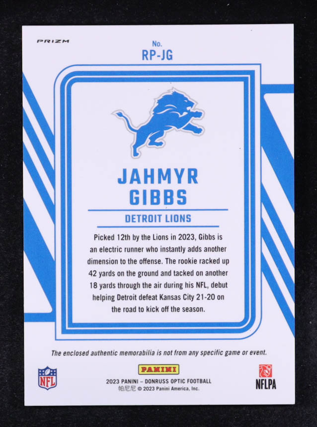 Jahmyr Gibbs 2023 Donruss Optic Rookie Phenoms Jerseys Blue Hyper #14 RC