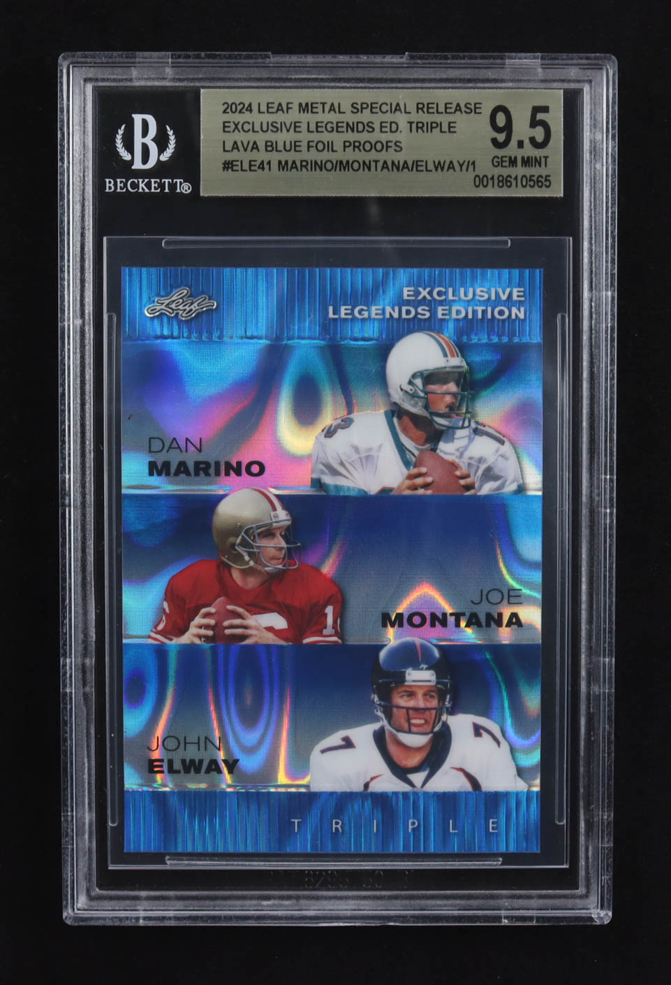Dan Marino / Joe Montana / John Elway 2024 Leaf Metal Special Release Exclusive Legends Ed. Triple Lava Blue Foil Proofs #ELE41 (BGS 9.5)