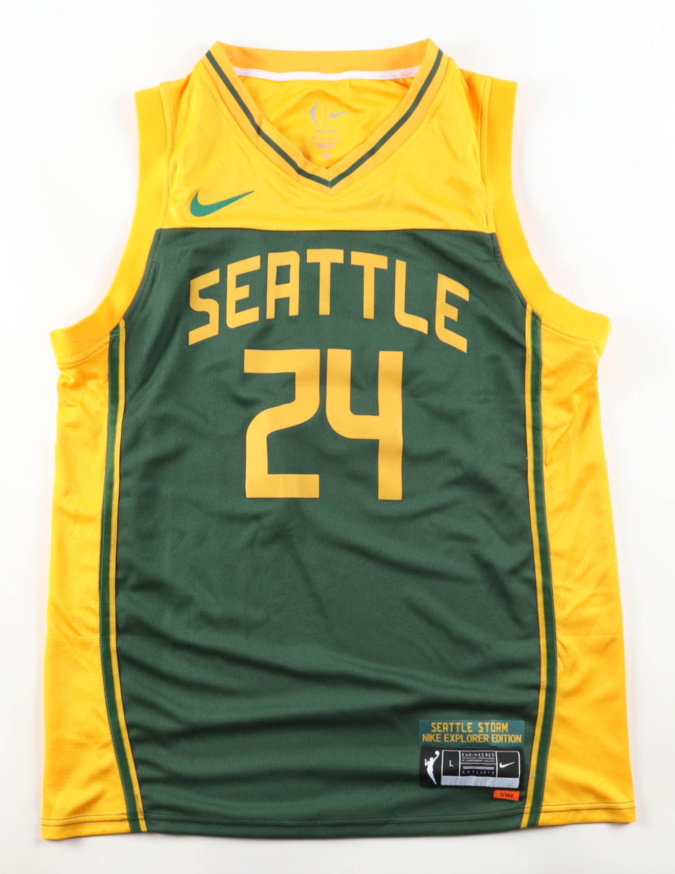 Nike authentic jersey with everything pressed on, size L. Hand-signed by Jewell Loyd (Seattle Storm).