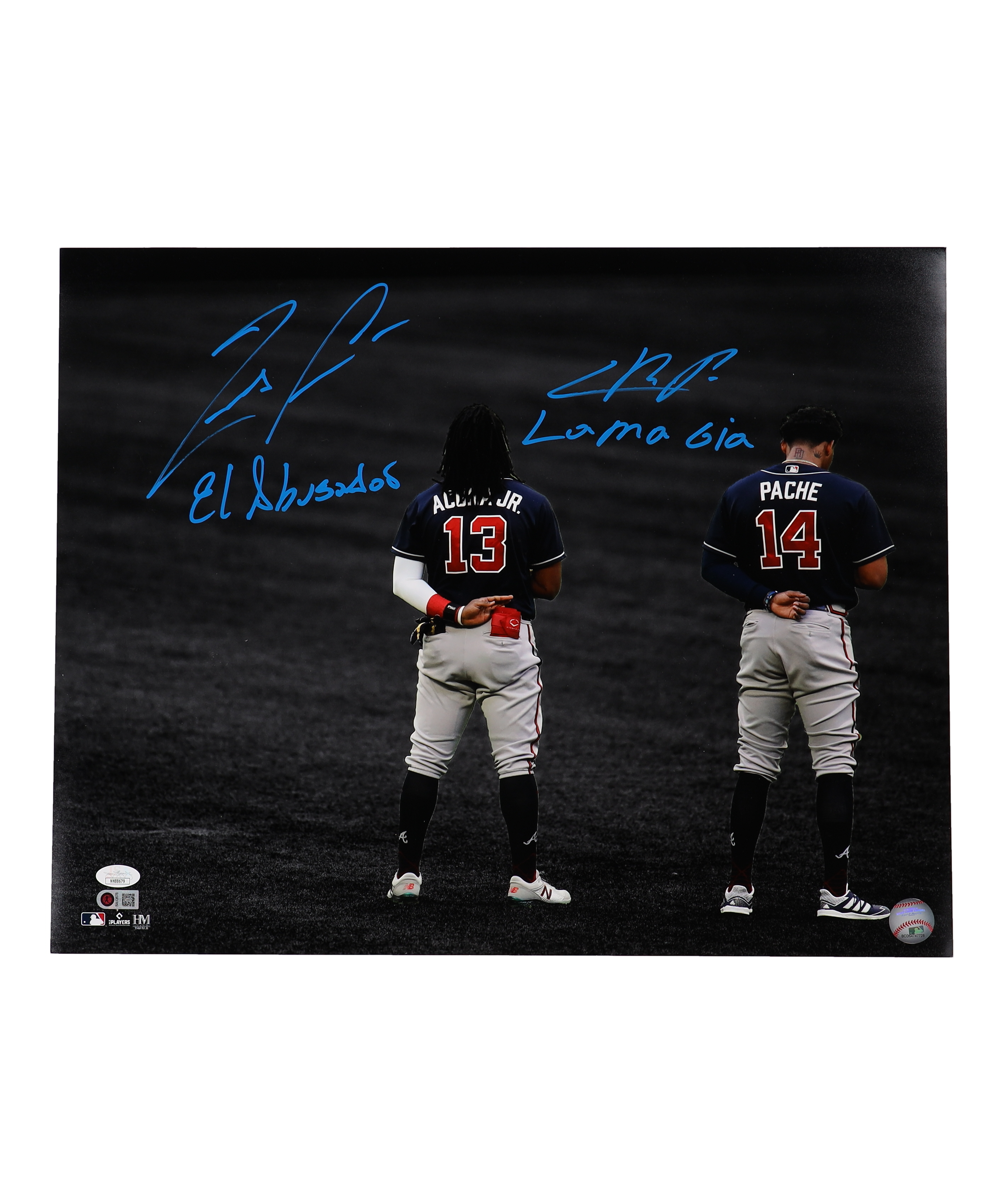 Photo measures 16" x 20" in size and has been hand-signed and inscribed by Ronald Acuna Jr. (Atlanta Braves) and Cristian Pache (Atlanta Braves).