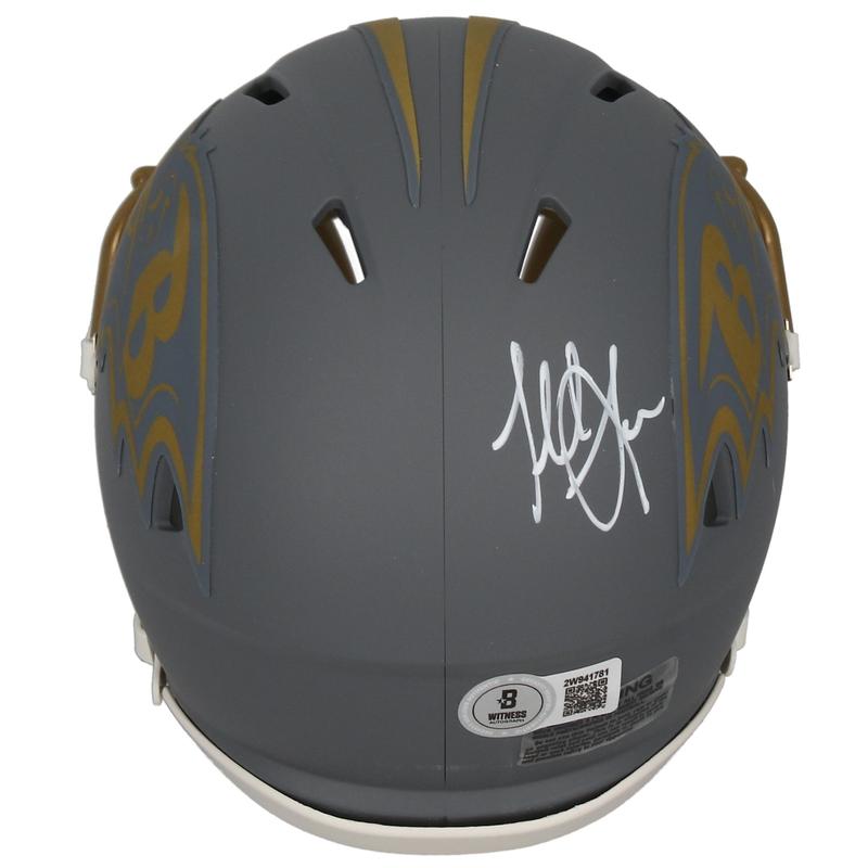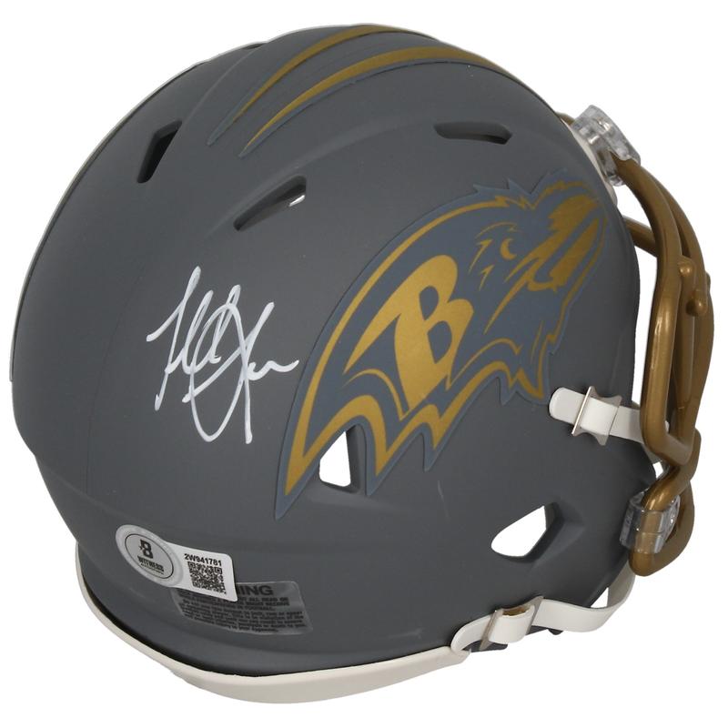 Riddell Baltimore Ravens slate alternate speed mini helmet has been hand-signed by Terrell Suggs.