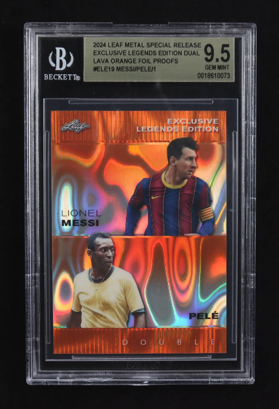 Lionel Messi / Pele 2024 Leaf Metal Special Release Exclusive Legends Ed. Dual Lava Orange Foil Proofs #ELE19 (BGS 9.5)