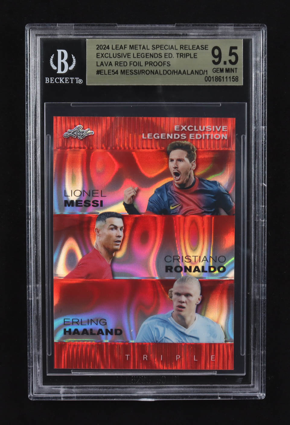 Lionel Messi / Erling Haaland / Cristiano Ronaldo 2024 Leaf Metal Special Release Exclusive Legends Ed. Triple Lava Red Foil Proofs #ELE54 (BGS 9.5)
