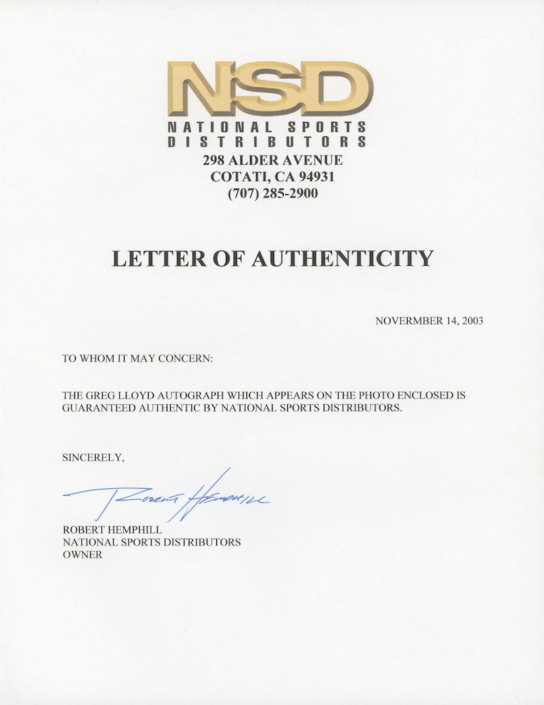 The lot / autograph(s) includes an official National Sports Distributors (NSD) Letter of Authenticity for authenticity purposes.