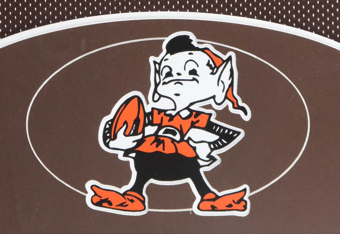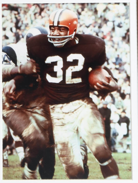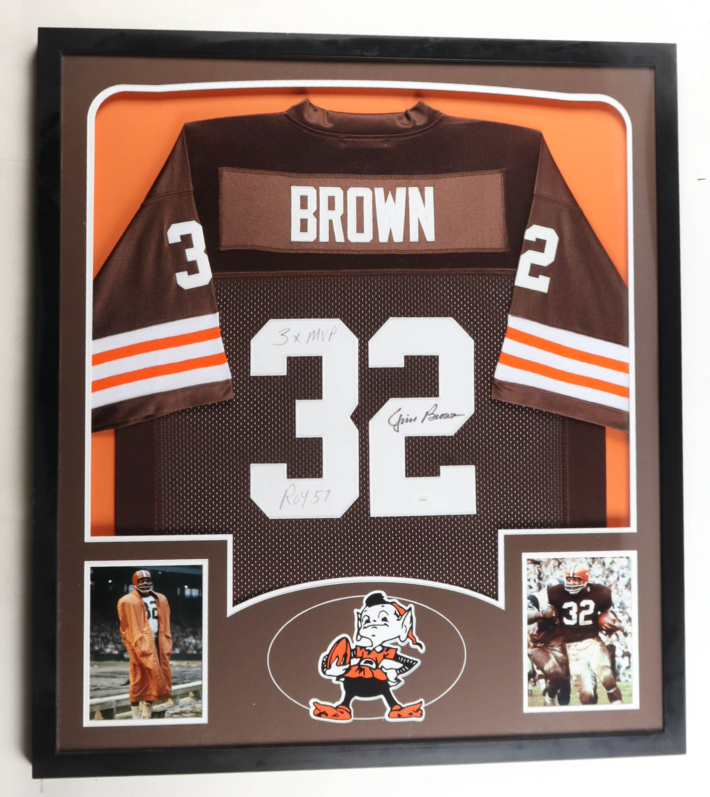Custom frame measures 33" x 37" in size and features a jersey that has been hand-signed and inscribed by Jim Brown (D. 2023, HOF). Display also includes (2) photos.