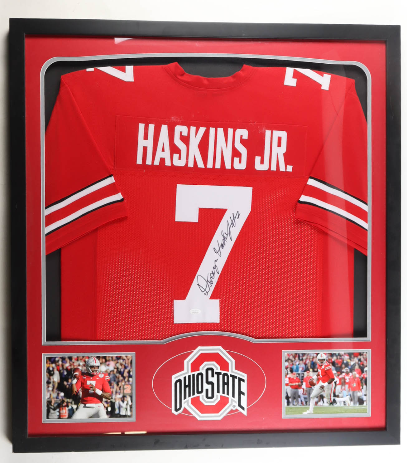Custom frame measures 34" x 37” in size and features a jersey that has been hand-signed by Dwayne Haskins (D. 2022).