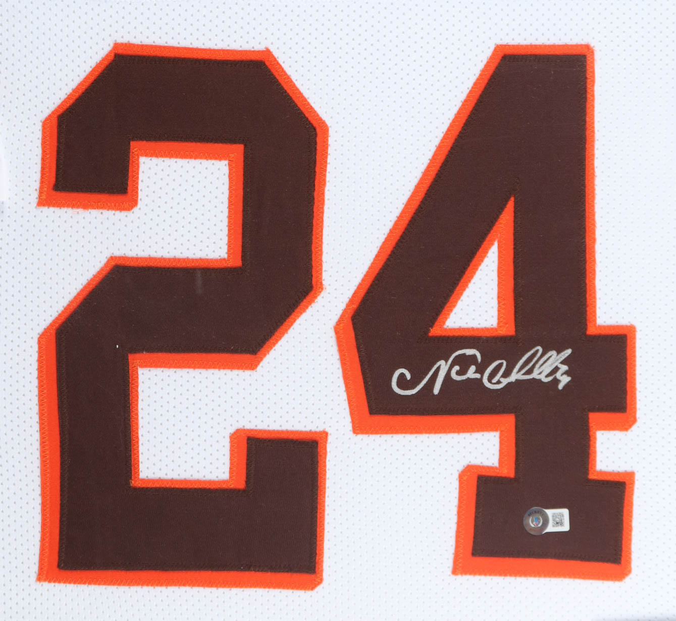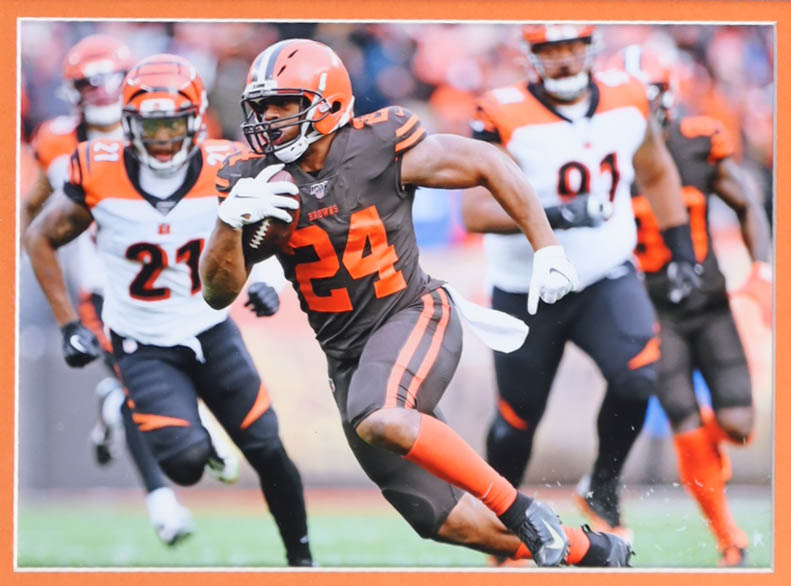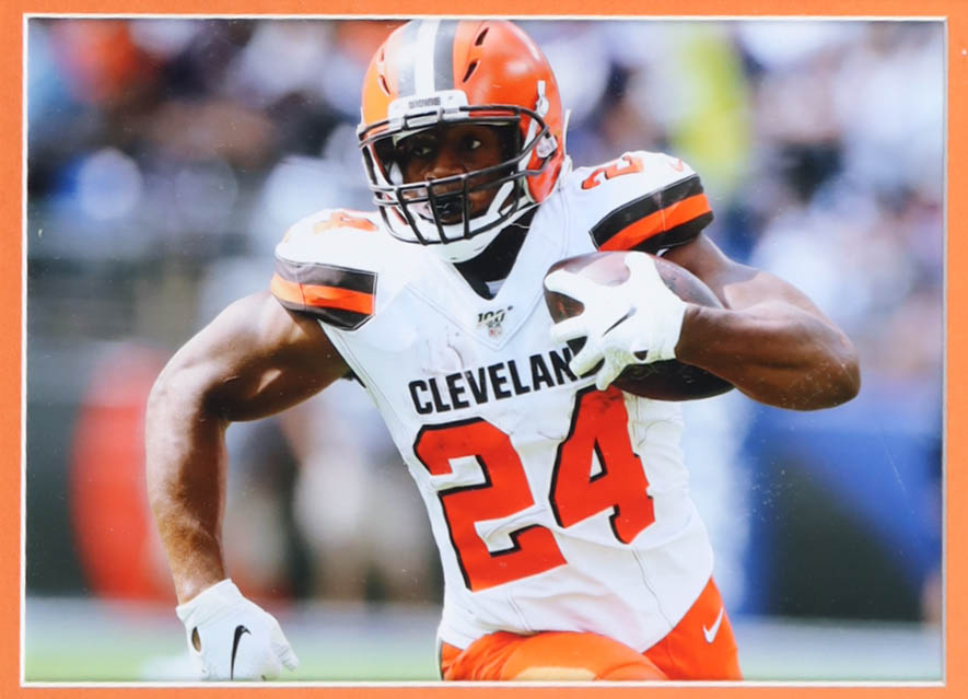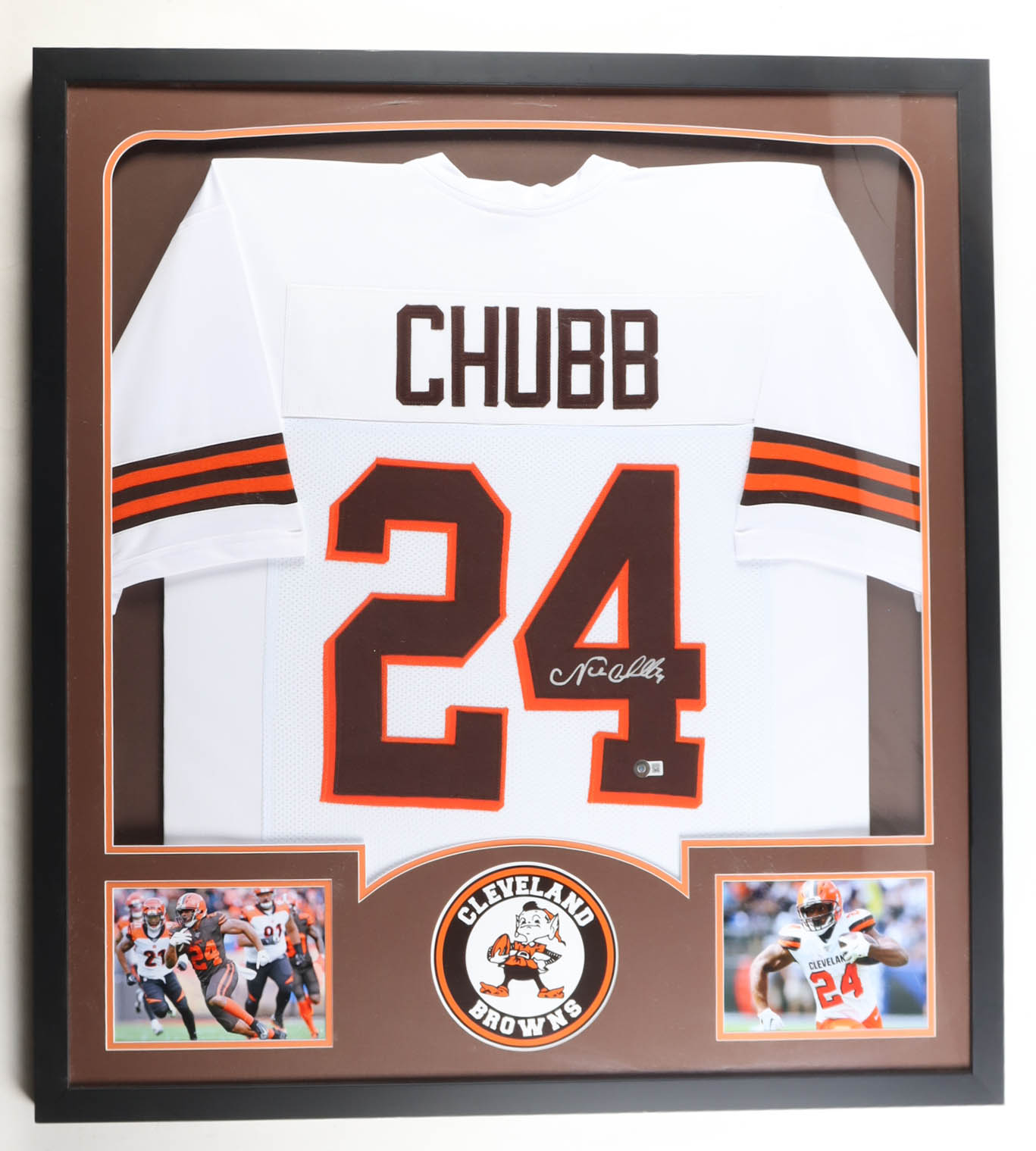 Custom frame measures 34" x 37” in size and features a jersey that has been hand-signed by Nick Chubb.