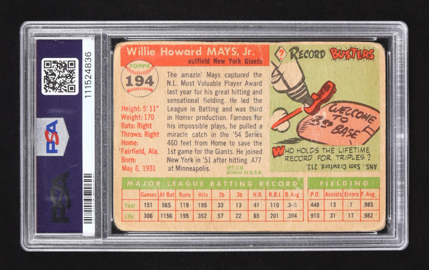 Willie Mays 1955 Topps #194 (PSA 1)