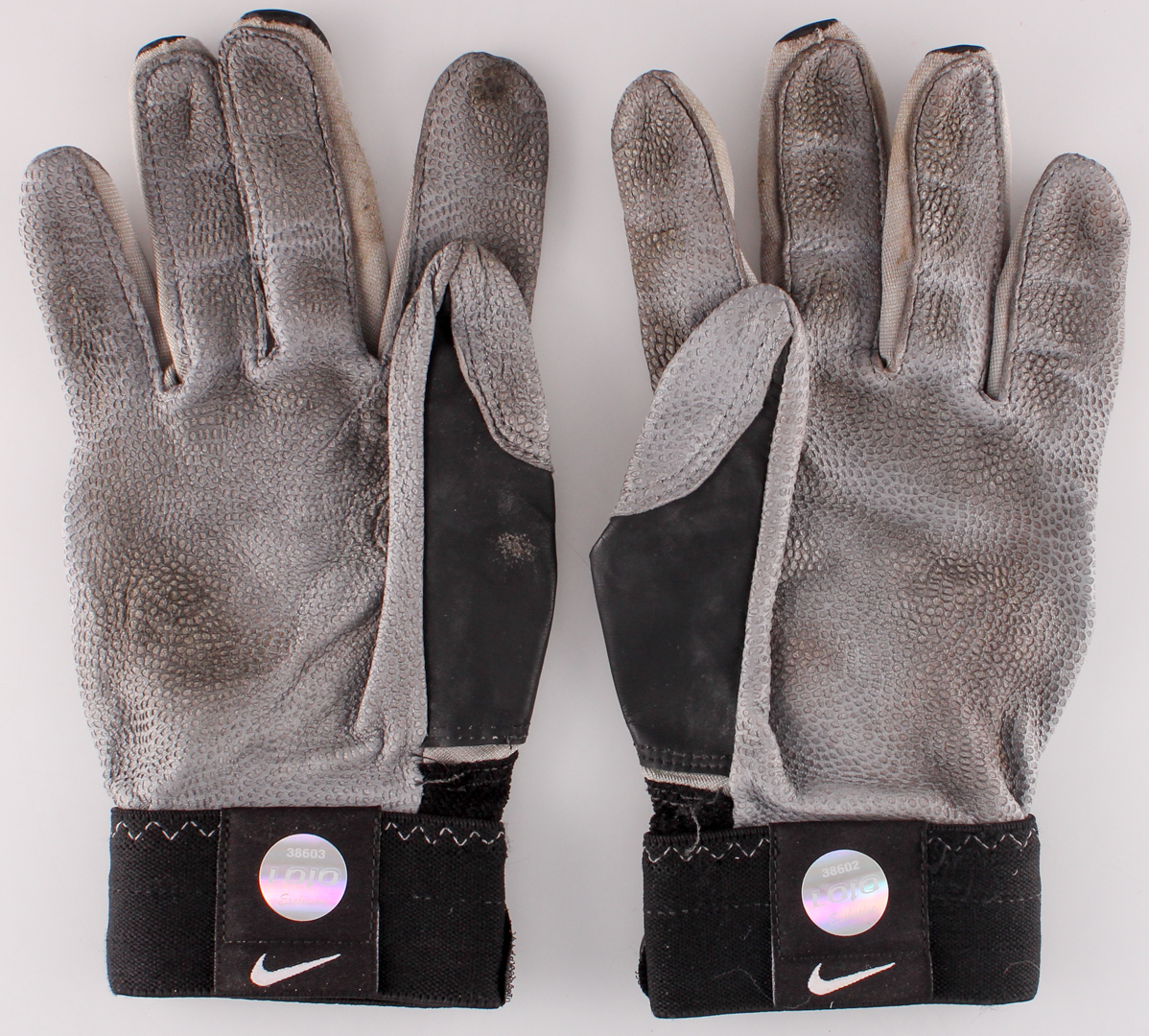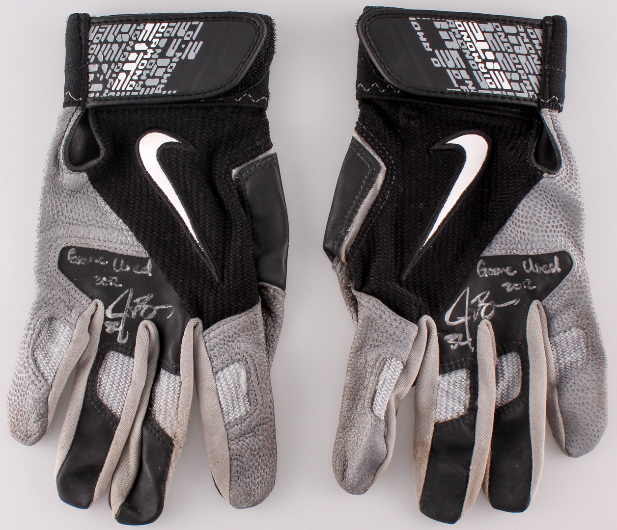 Lot includes a pair of Nike batting gloves which were used by Jay Bruce during his 2012 season with the Cincinnati Reds. Each glove is hand-signed and inscribed "Game Used 2012" in silver paint pen by Bruce.