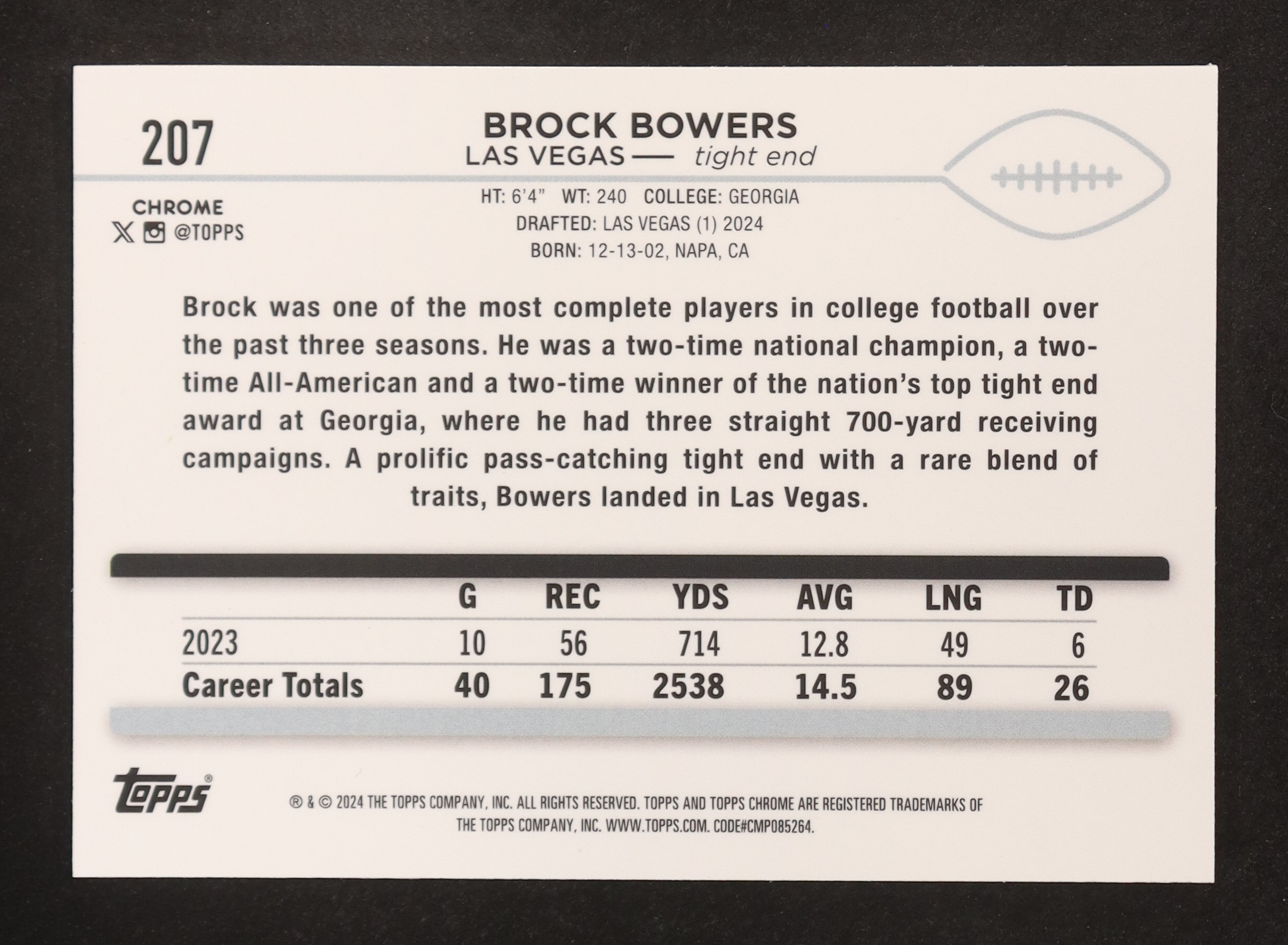 Brock Bowers 2024 Topps Chrome Sapphire #207 RC