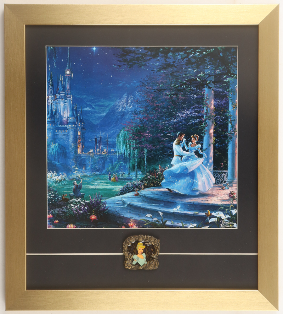 Custom frame measures approximately 16" x 18" in size and features an art print by Thomas Kinkade (D. 2012). The display also includes a stained glass Cinderella pin. Please note, the display is unsigned.