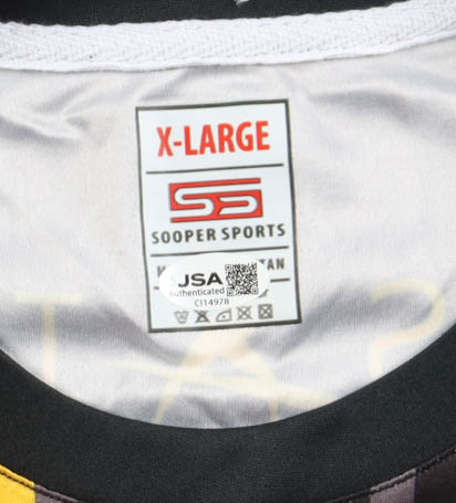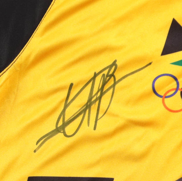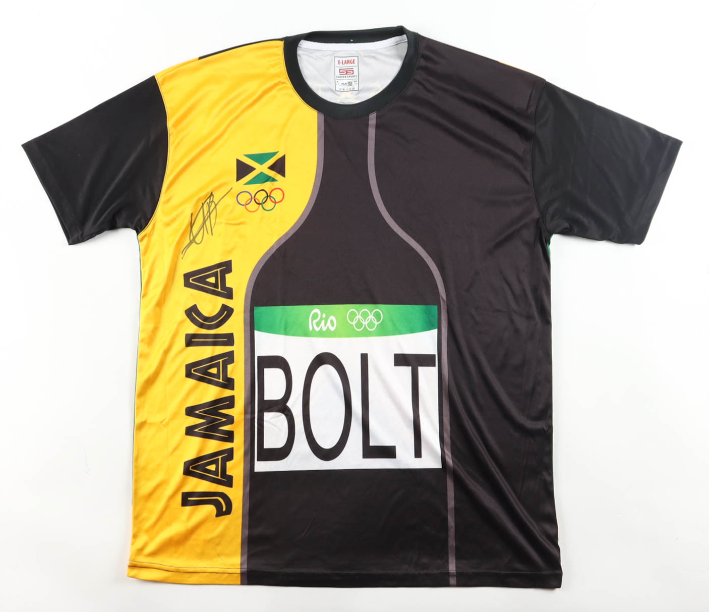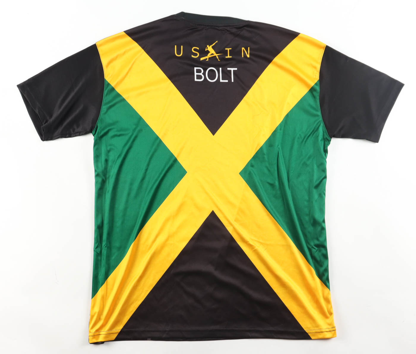 Sooper Sports jersey with everything printed on, size XL Hand-signed by Usain Bolt.