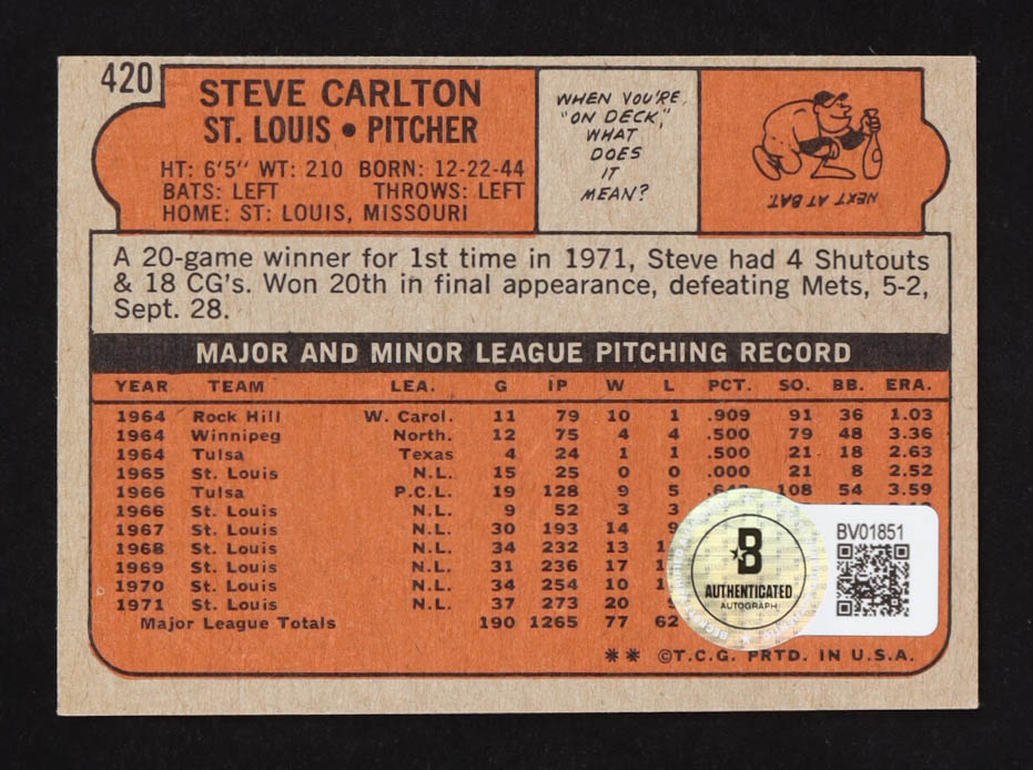 Steve Carlton Signed 1972 Topps #420 (Beckett)