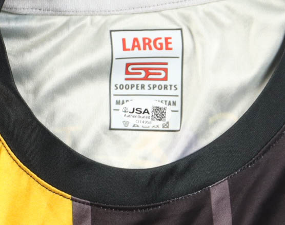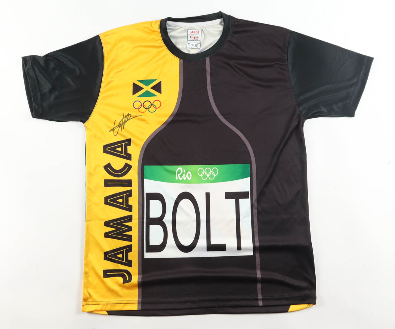 Sooper Sports jersey with everything printed on, size L Hand-signed by Usain Bolt.