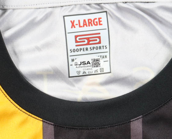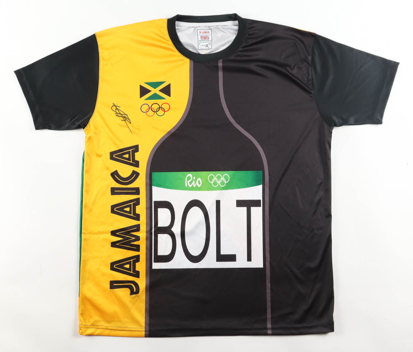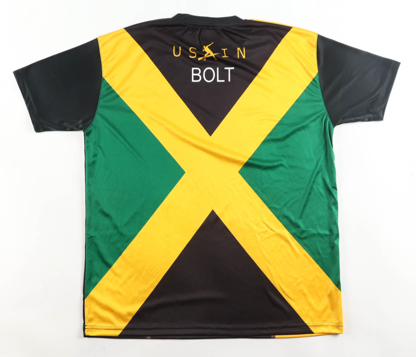 Sooper Sports jersey with everything printed on, size XL Hand-signed by Usain Bolt.