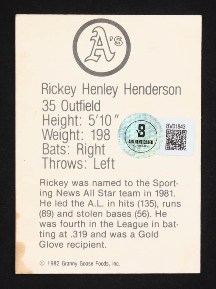 Rickey Henderson Signed 1982 A's Granny Goose #4 (Beckett)