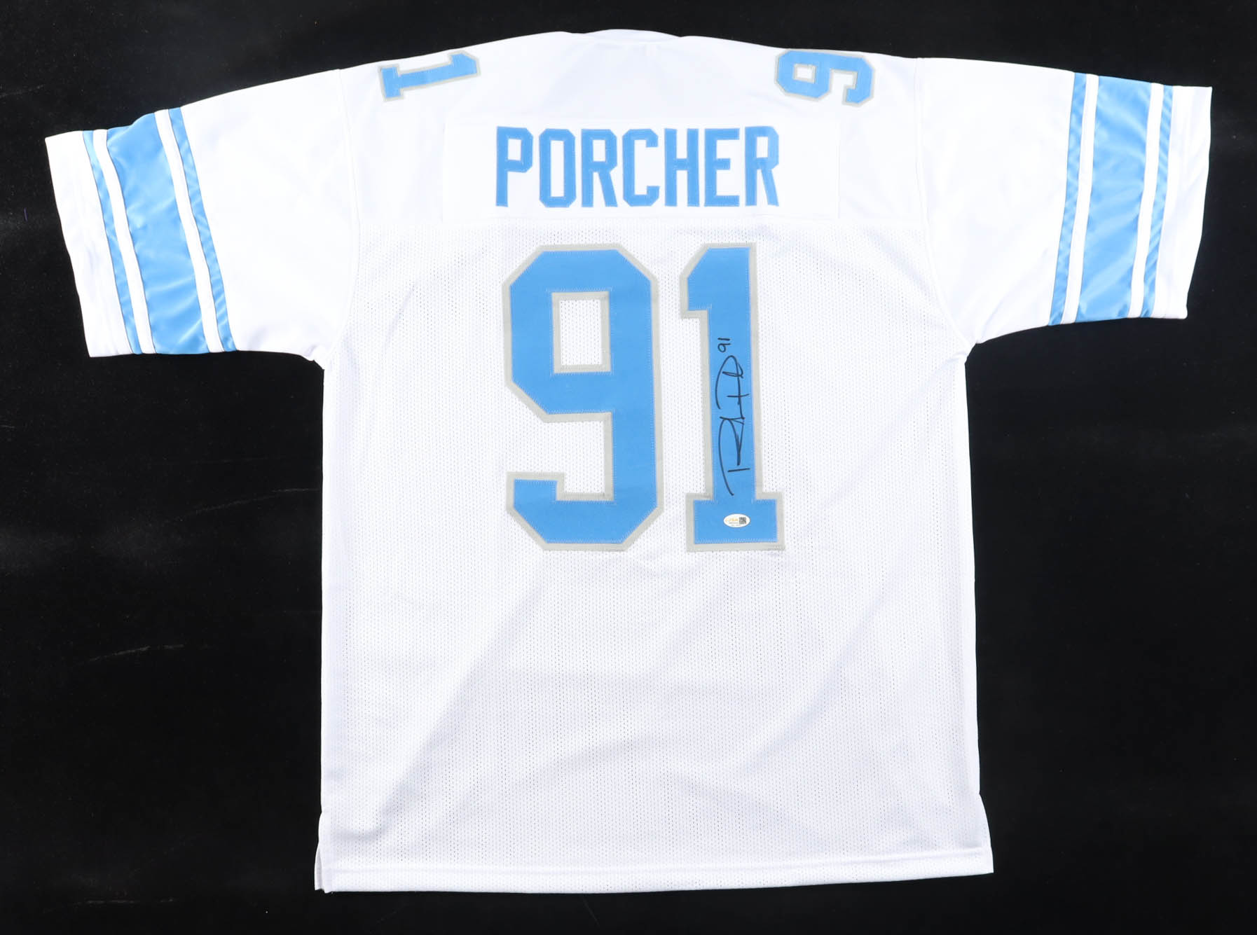 Custom jersey with everything sewn on, size XL. Hand-signed by Robert Porcher (Detroit Lions).