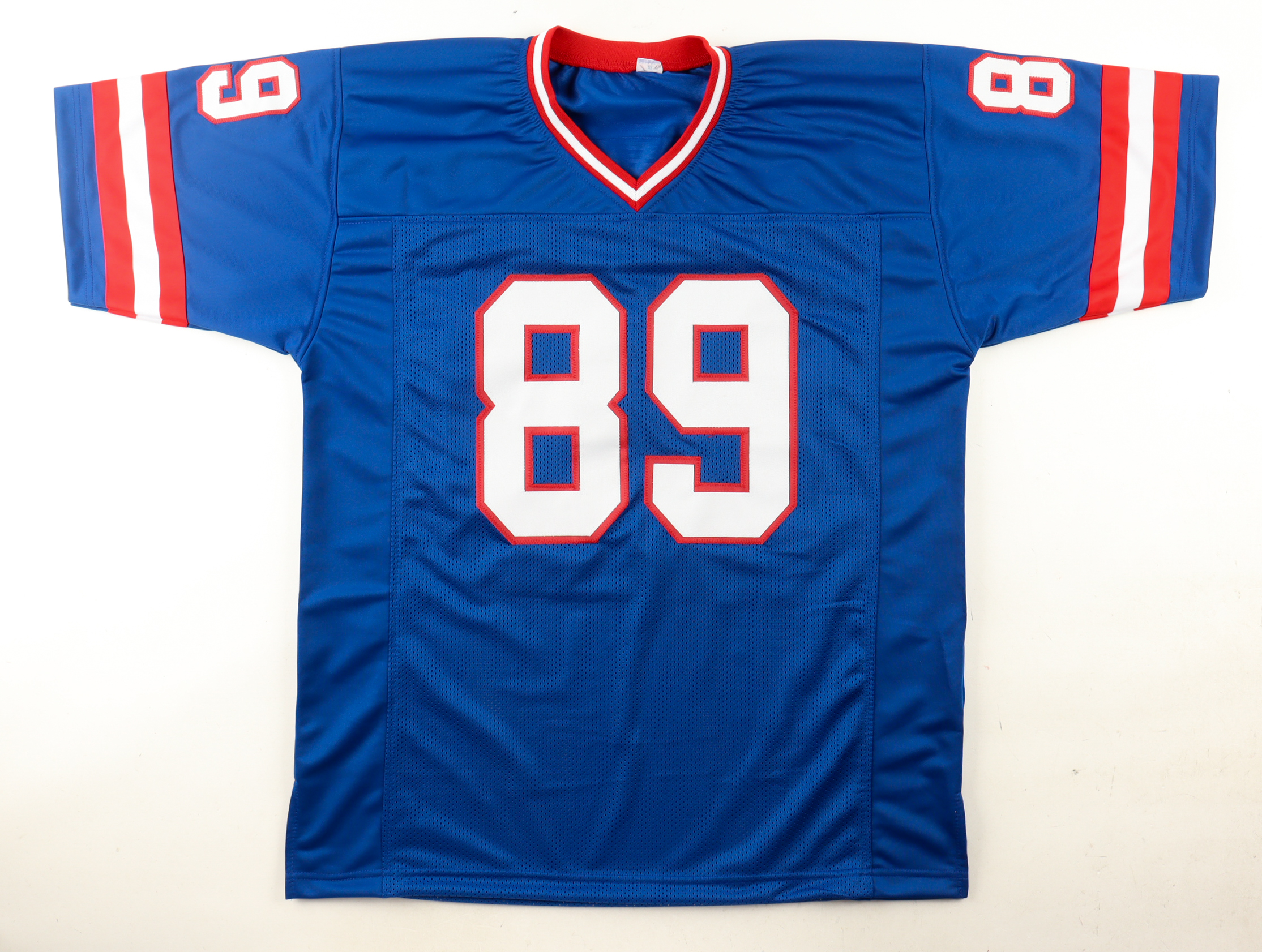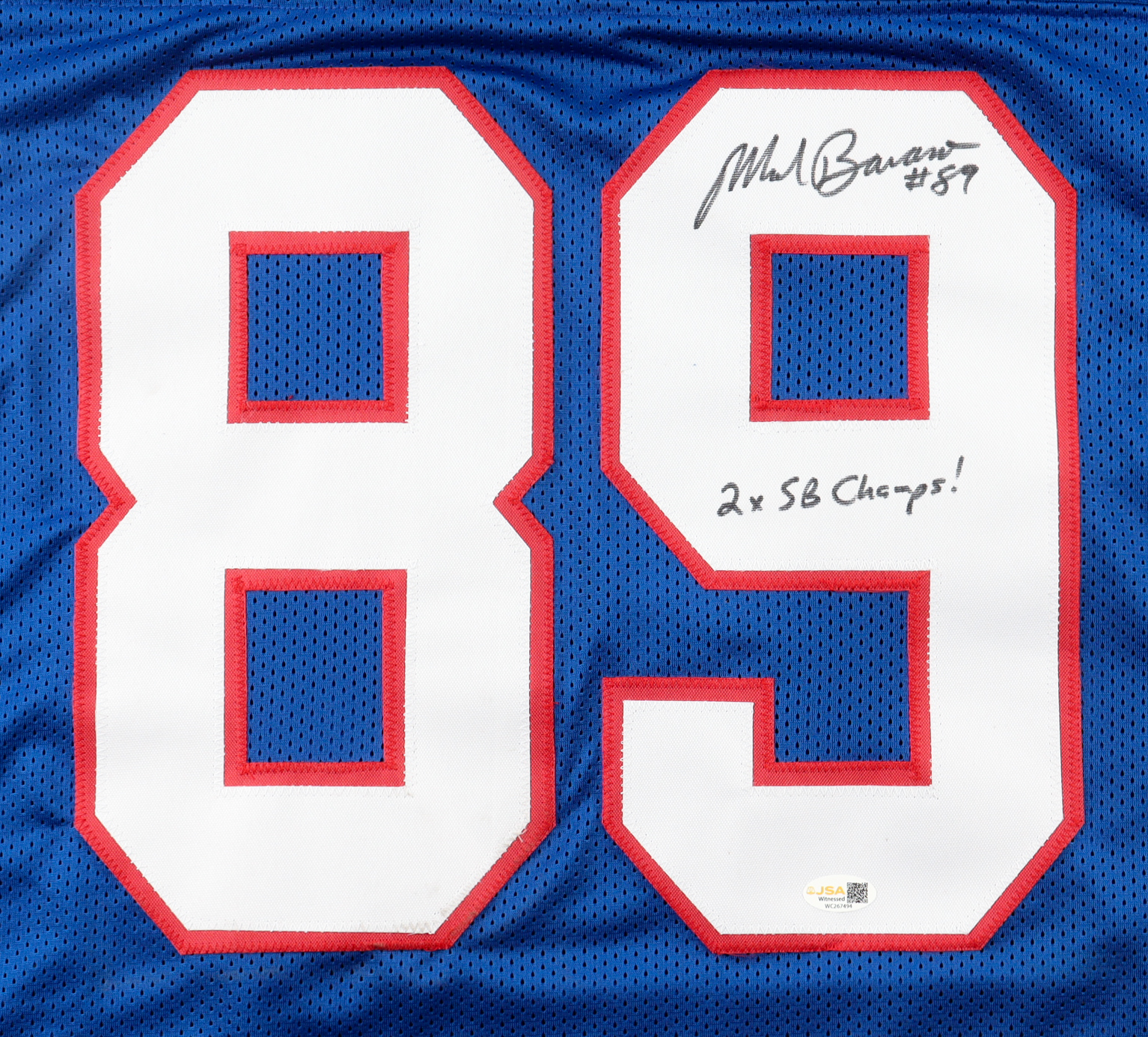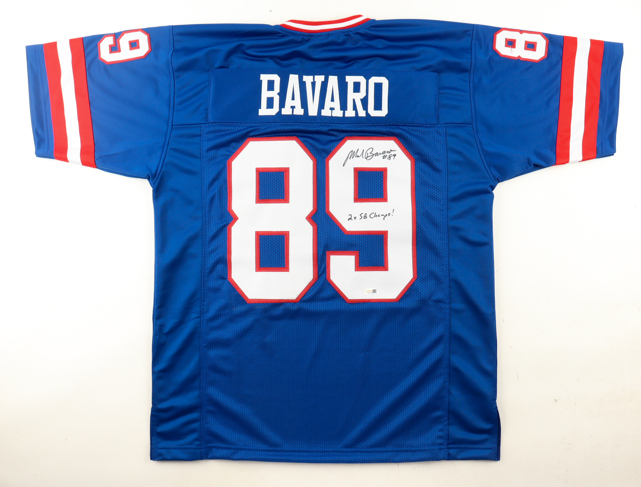 Custom jersey with everything sewn on, size XL. Hand-signed and inscribed by Mark Bavaro.