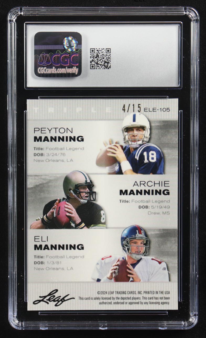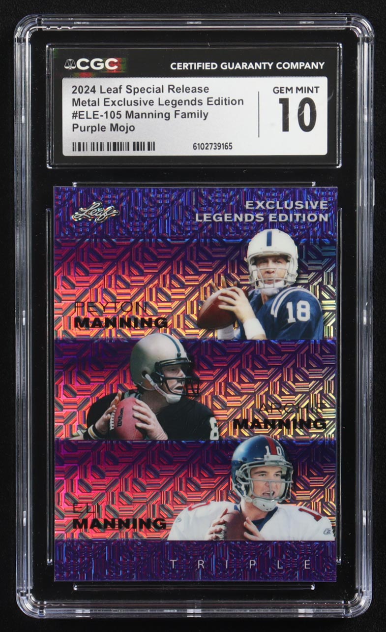 Archie Manning / Peyton Manning / Eli Manning 2024 Leaf Metal Special Release Exclusive Legends Ed. Manning Family Purple Mojo Triple #ELE-105 #4/15 (CGC 10)
