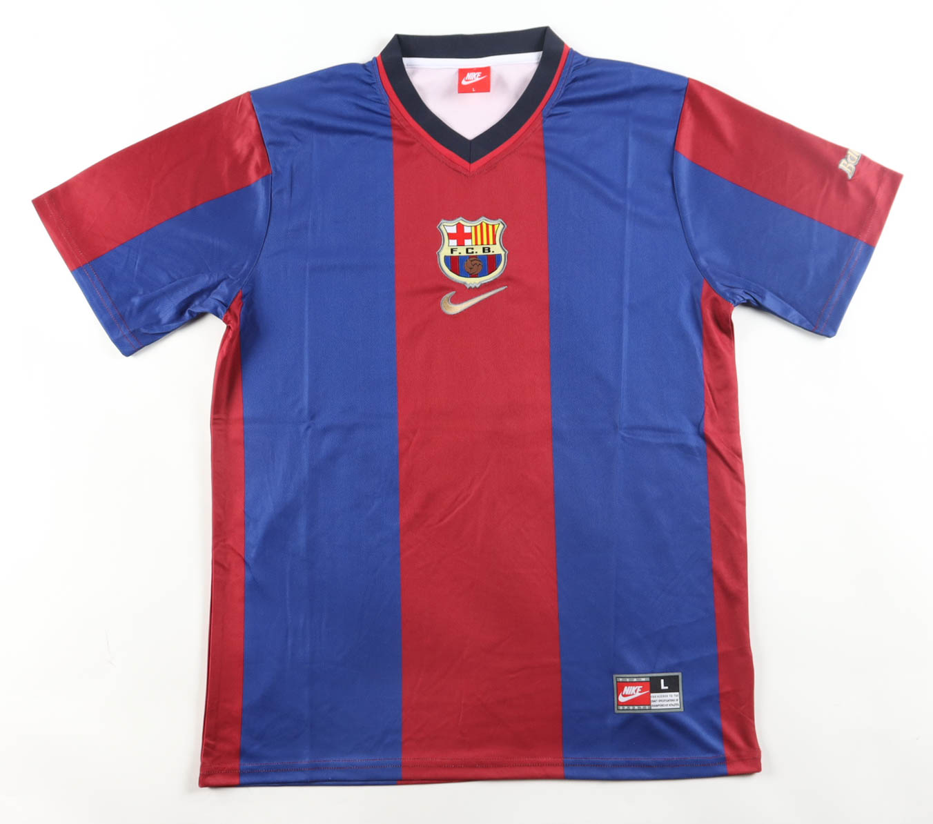 Nike jersey. Everything is sewn/pressed on, size L. Hand-signed by Rivaldo Ferreira (F.C. Barcelona).