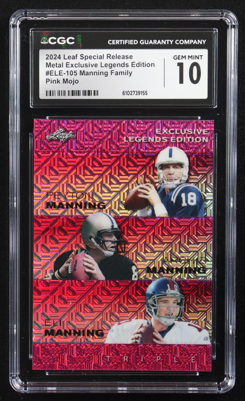 Archie Manning / Peyton Manning / Eli Manning 2024 Leaf Metal Special Release Exclusive Legends Ed. Manning Family Pink Mojo Triple #ELE-105 #1/10 (CGC 10)