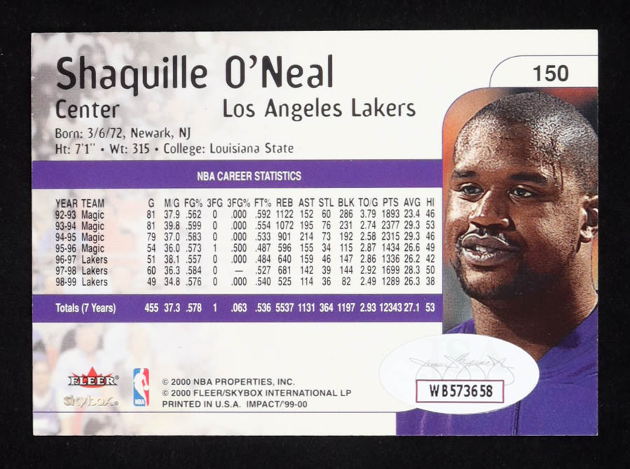 Shaquille O'Neal Signed 1999-00 SkyBox Impact #150 (JSA)