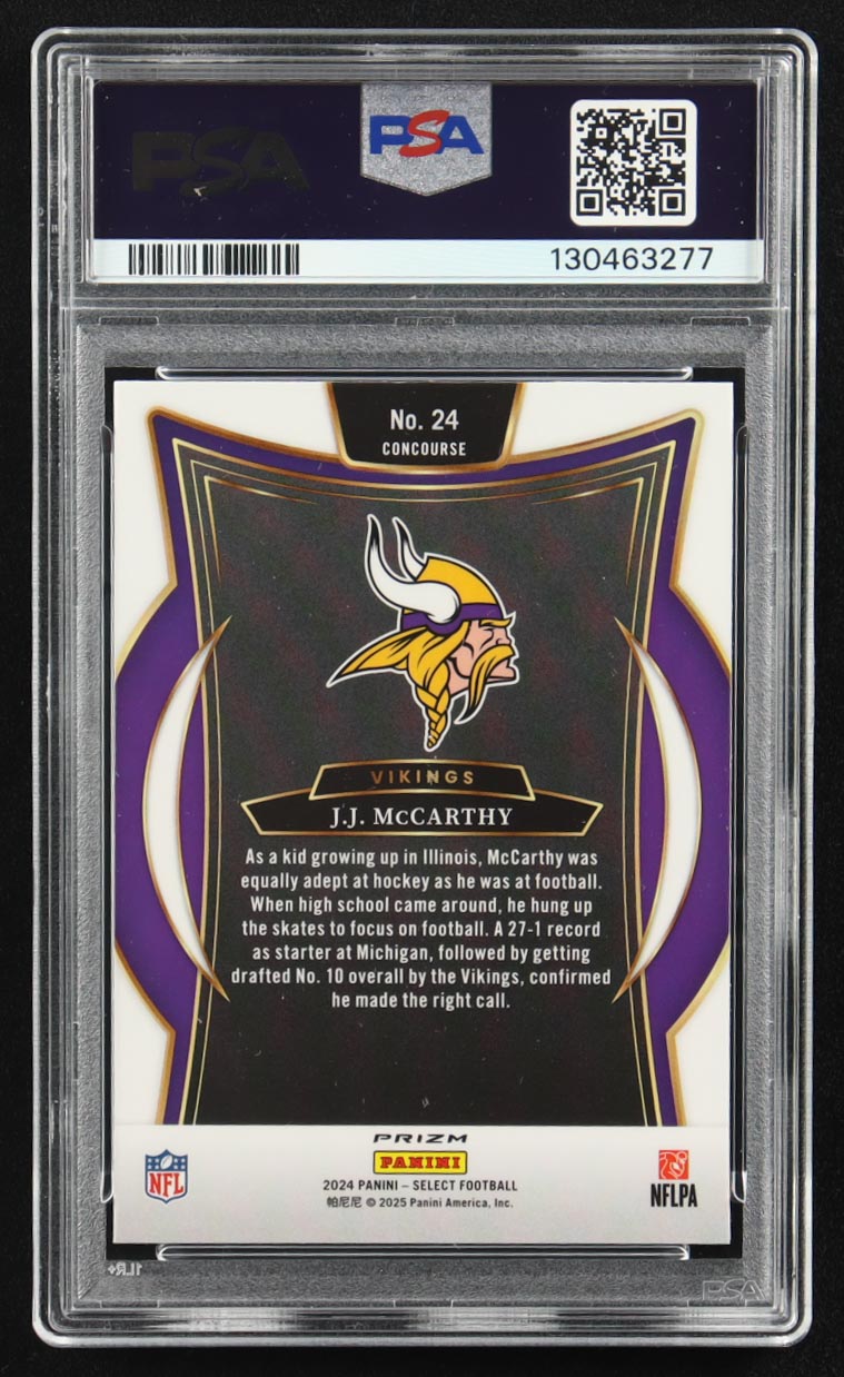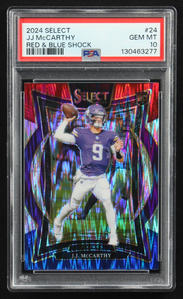 JJ McCarthy 2024 Select Prizm Red and Blue Shock #24 RC (PSA 10)