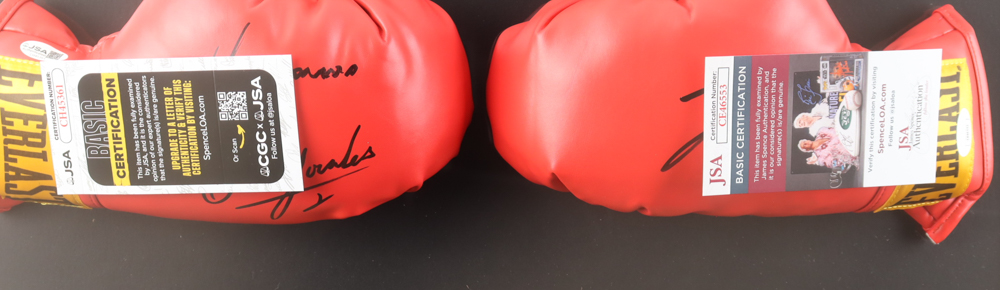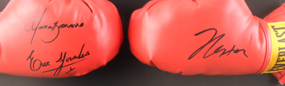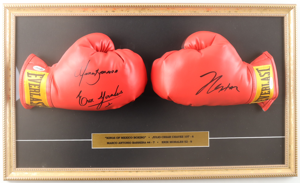 Custom frame measures approximately 18" x 30 and features a pair of (2) Everlast boxing gloves. One glove has been hand-signed by Marco Antonio Barrera and Erik Morales and the other glove has been hand-signed by Julio Cesar Chavez. Display also includes a statistics plaque.