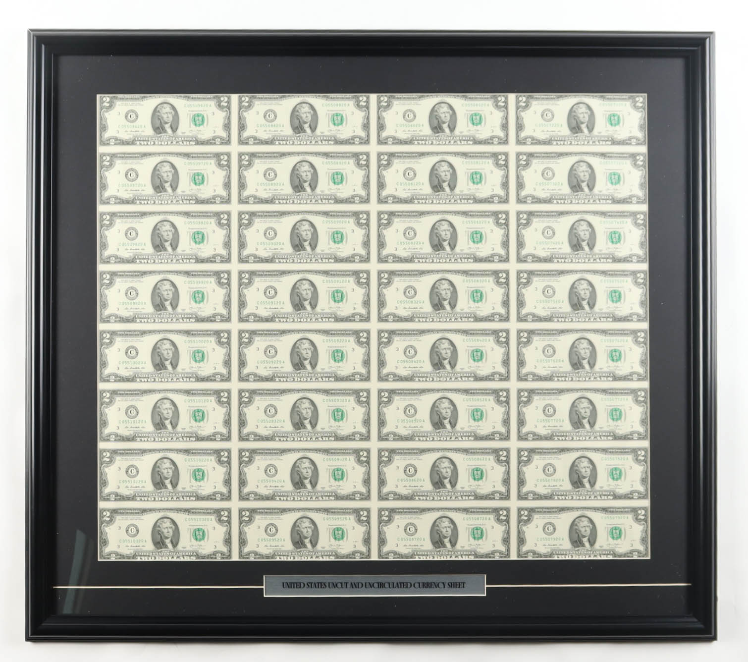 Custom frame measures approximately 27" x 30" in size and features an uncut sheet of (32) 2013 U.S. $2 dollar bills. Please note, the display is unsigned.