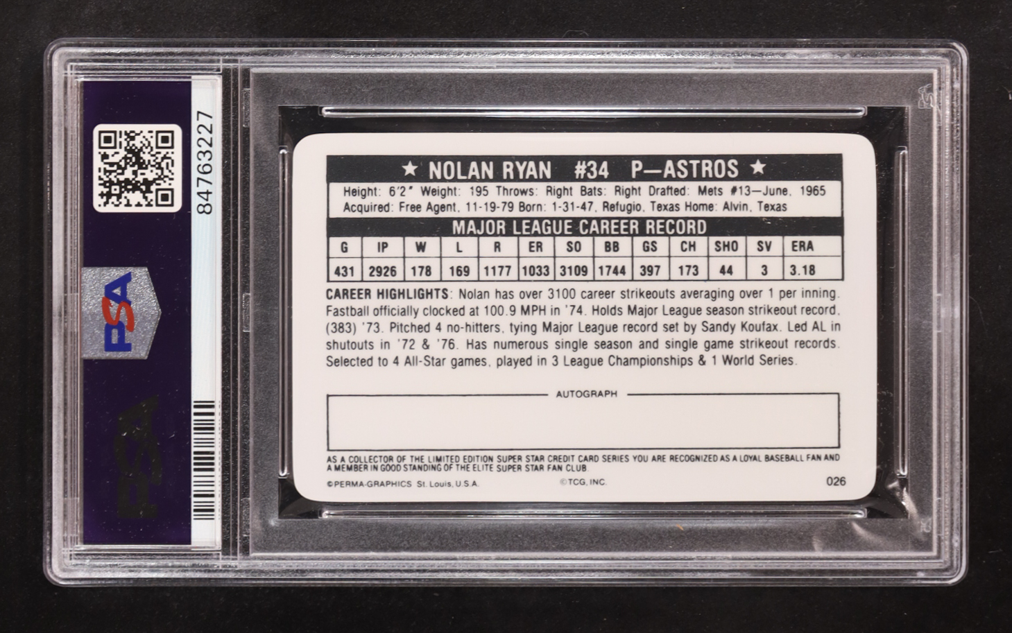 Nolan Ryan 1981 Perma-Graphic Credit Cards #26 (PSA 9)