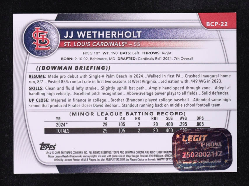 JJ Wetherholt Signed 2025 Bowman Chrome Prospects #BCP22 RC (Prova)