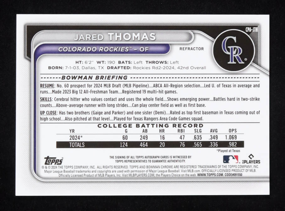 Jared Thomas 2024 Bowman Chrome Draft Autographs Refractors #CPAJTH #269/499 RC