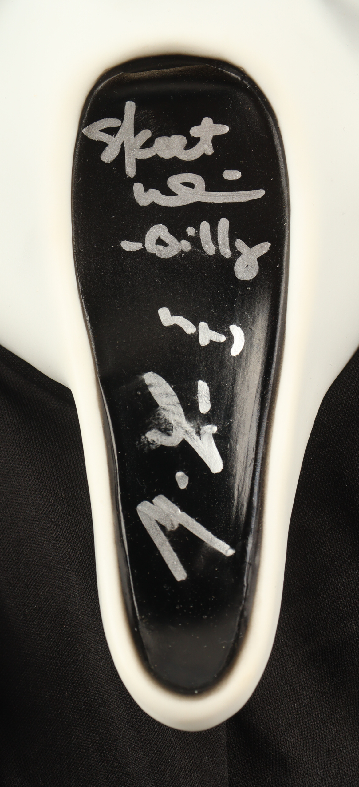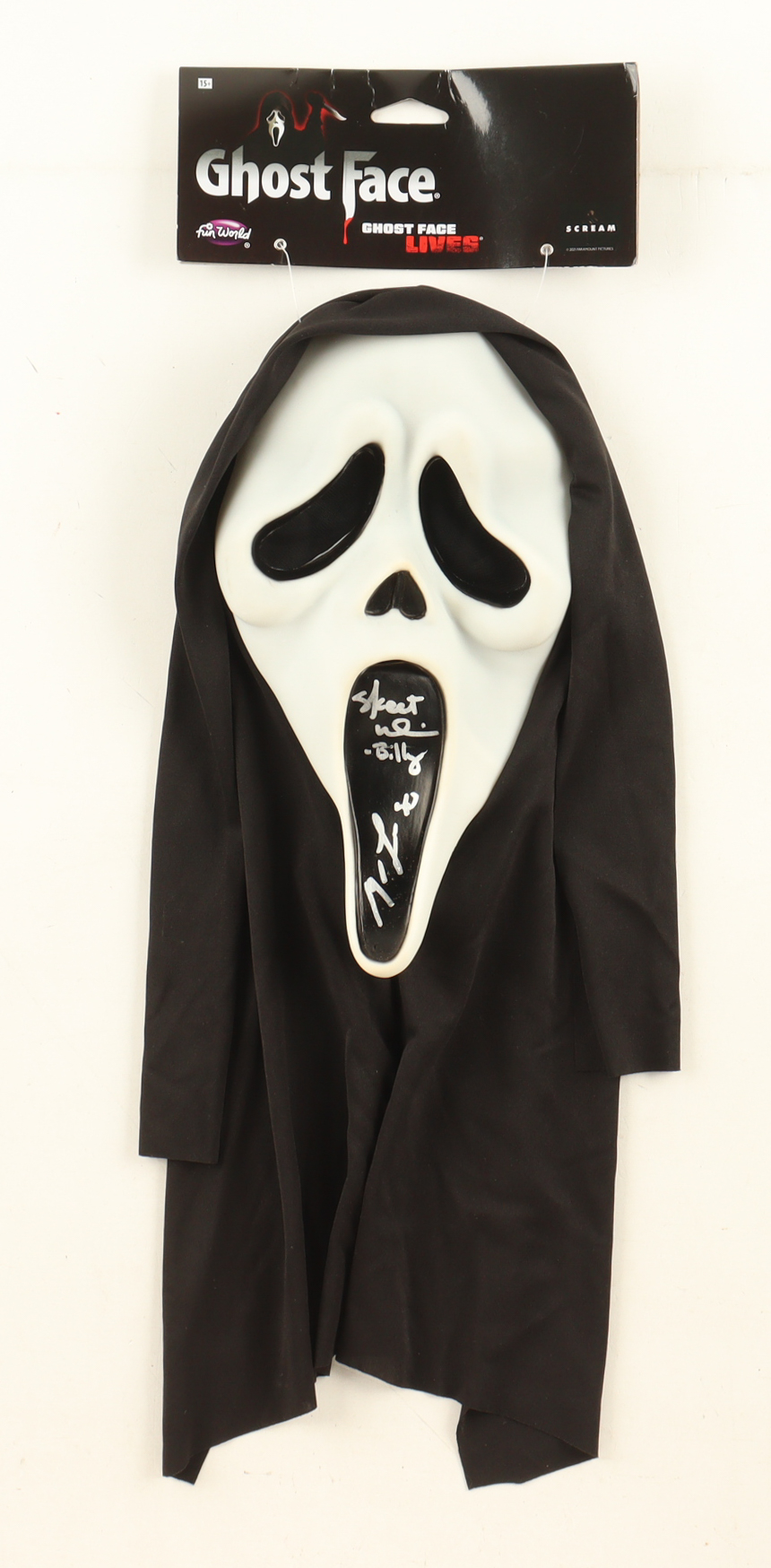 "Scream" Ghostface mask has been hand-signed and inscribed by Matthew Lillard (Stu Macher) and Skeet Ulrich (Billy). Please note the mask is scuffed and signature is smudged.